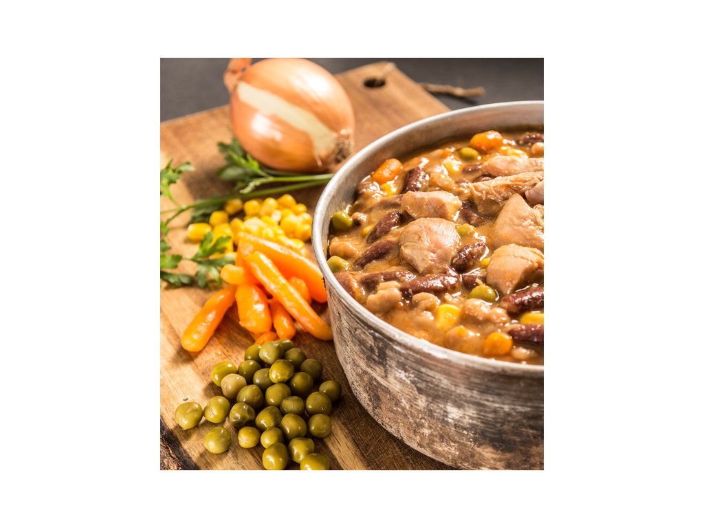 Složení: kuřecí stehenní maso (30%), zelenina ( kukuřice, hrášek, mrkev), fazole (20%), cibule, mouka rýžová, mouka kukuřičná, řepkový olej, sůl, paprika, pepř, chilli.