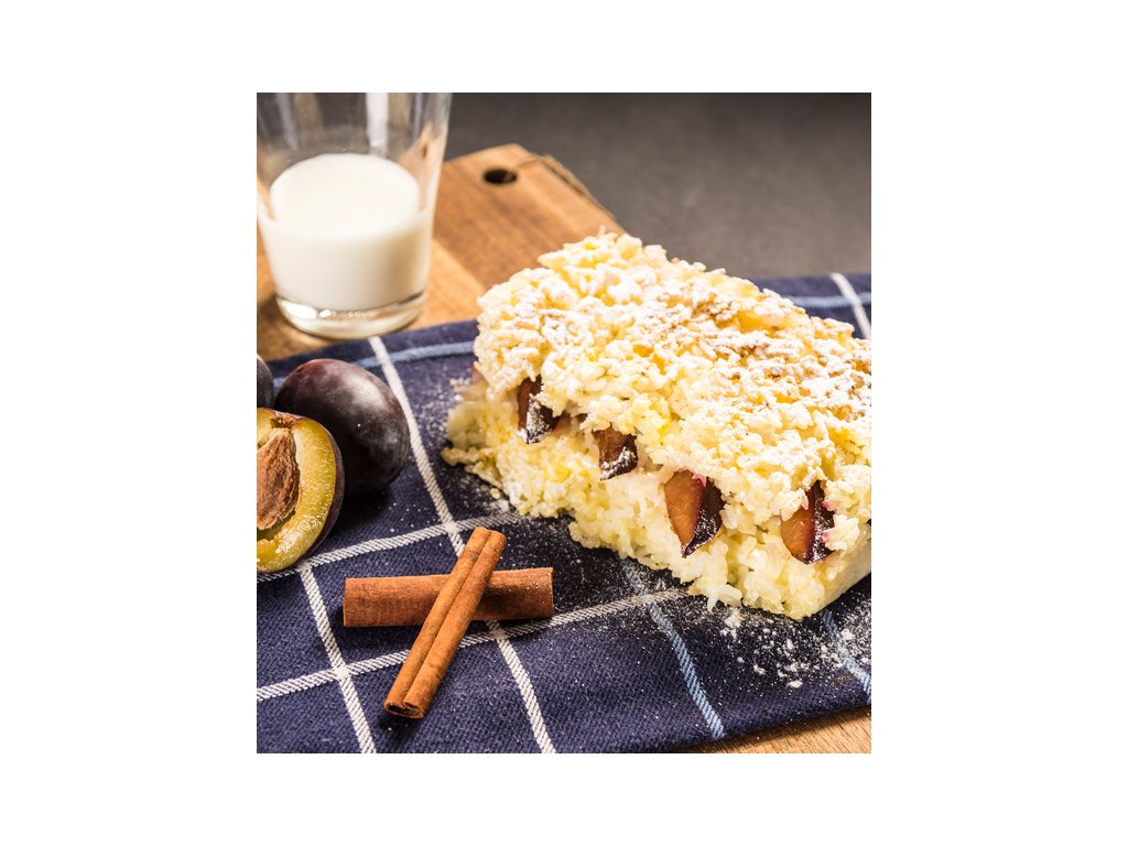 Složení: mléko, švestky kompotované (24%)(švestky, voda, cukr), rýže ( 15 %), cukr, vejce, máslo, sůl, skořice.