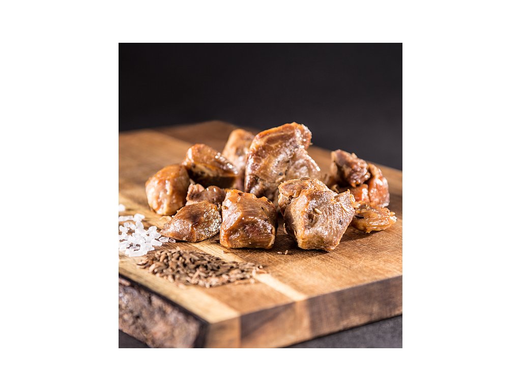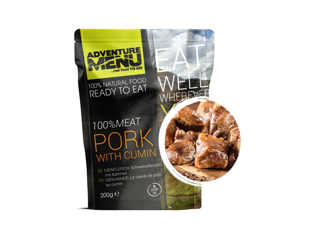 Tak to je opravdu maso! Ručně očištěné a porcované kousky vepřové plece pečené v páře spolu s kmínem. Díky vyššímu obsahu tuku je maso hezky šťavnaté, chutné a ani potom co ztratí pečením třetinu své váhy není vysušené. Malá hmotnost a vysoká výživová hodnota předurčuje použití masa i v případě, že cestujete na lehko.