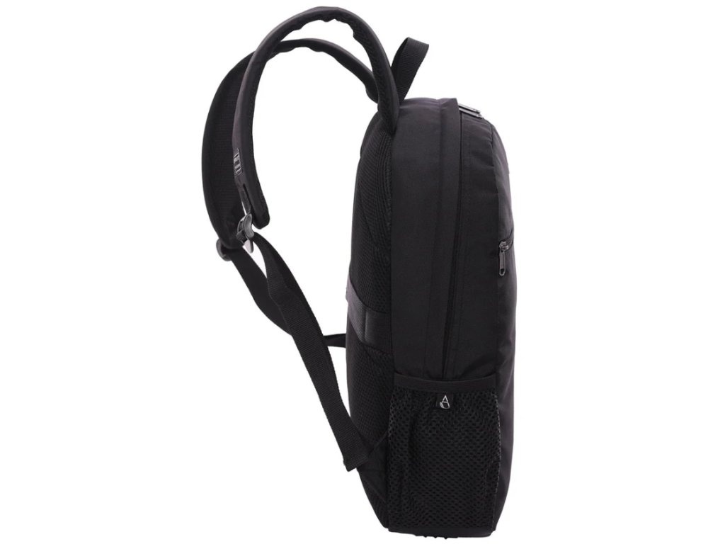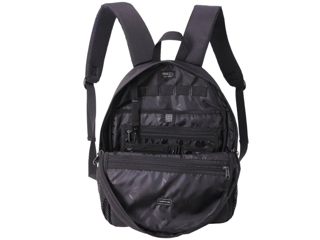 Batoh má jeden hlavní prostor, na přední straně menší kapsu a na bocích jsou kapsičky ze síťoviny. Uvnitř batohu je polstrovaný prostor pro notebook a organizér.