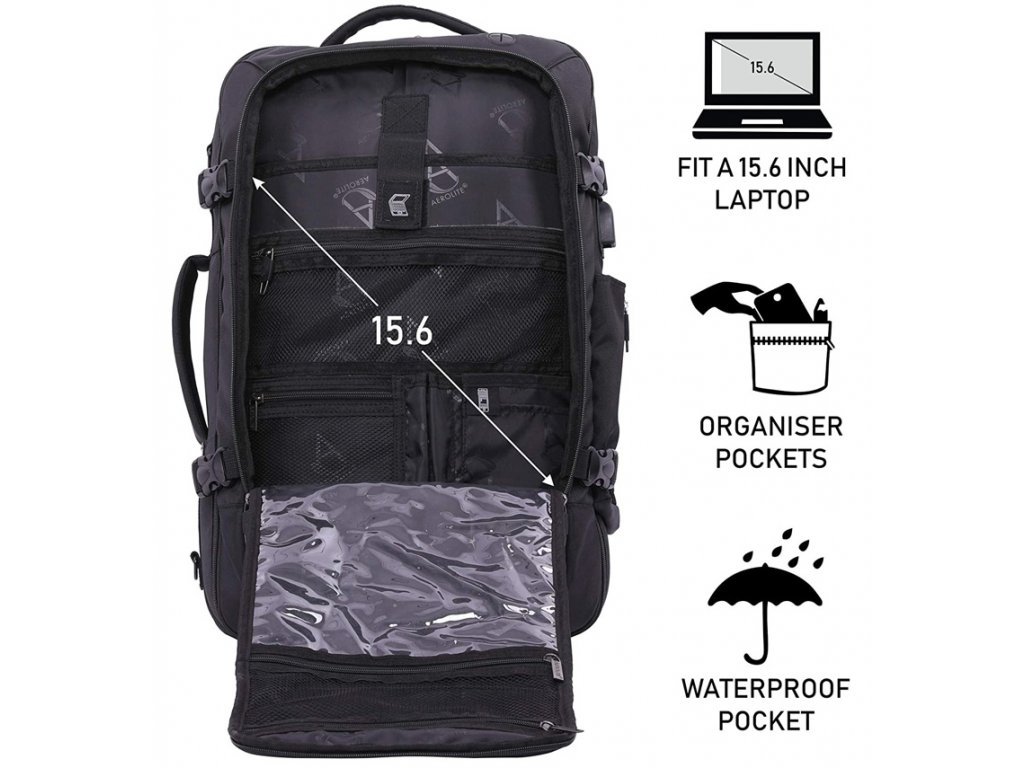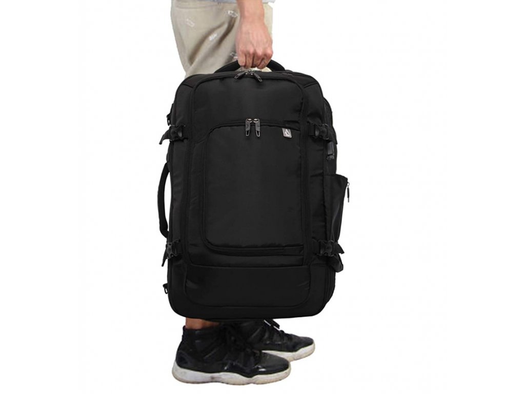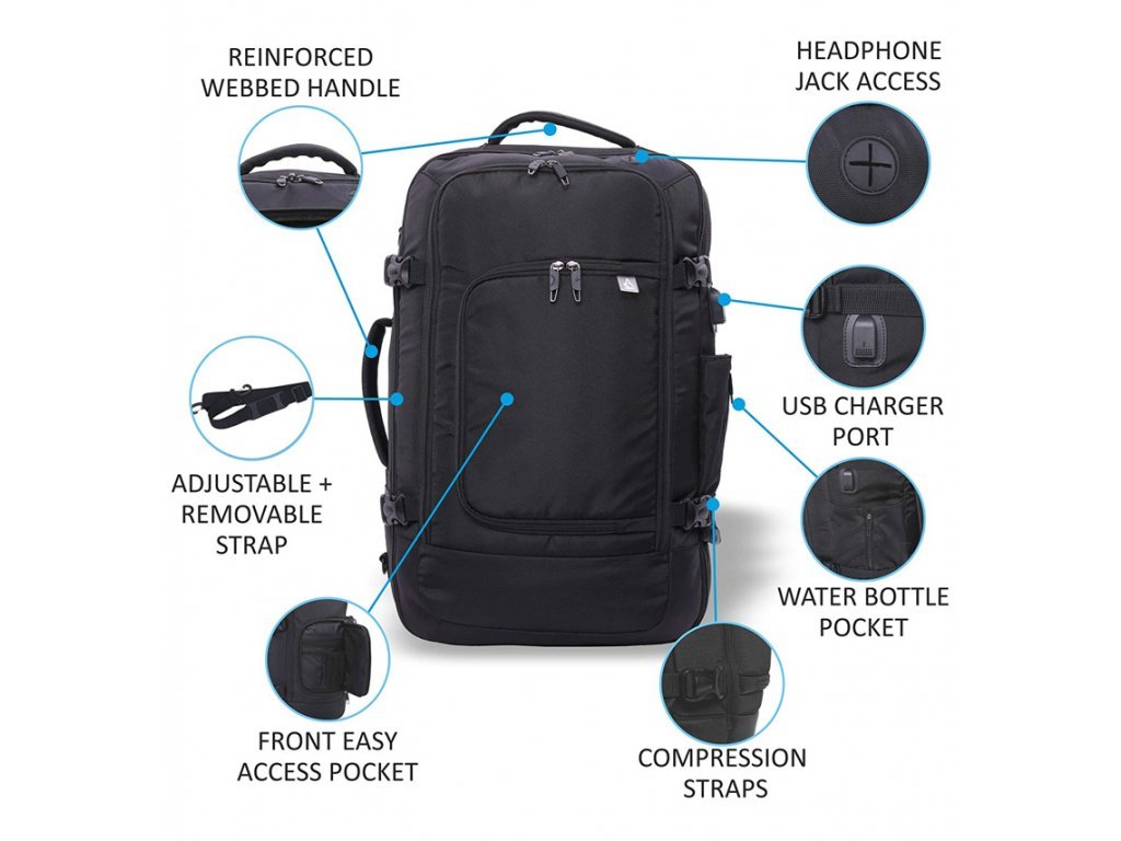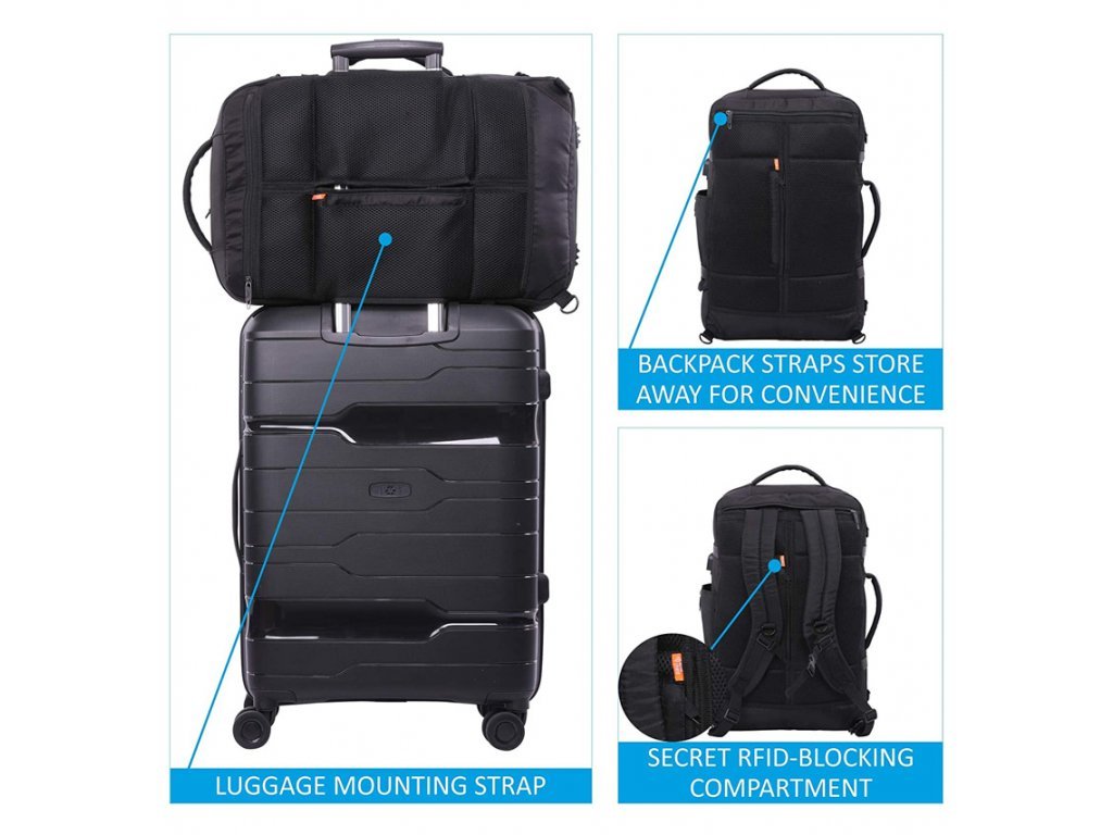 - na zadní straně batohu jsou umístěny otvory, kterými můžete prostrčit výsuvné madlo cestovního kufru