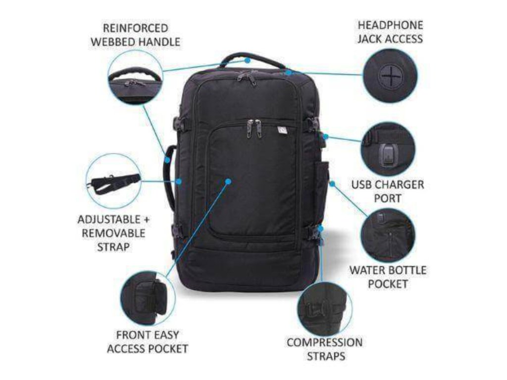 Toto zavazadlo má polstrované ramenní popruhy a záda ze síťoviny a lze je nosit jako batoh pro přepravu bez použití rukou. Popruhy lze schovat, když je nepoužíváte, v praktické kapse na zip. Můžete ho také nosit na rameni pomocí odnímatelného ramenního popruhu, nebo v ruce pomocí měkké vyztužené horní nebo boční rukojeti.