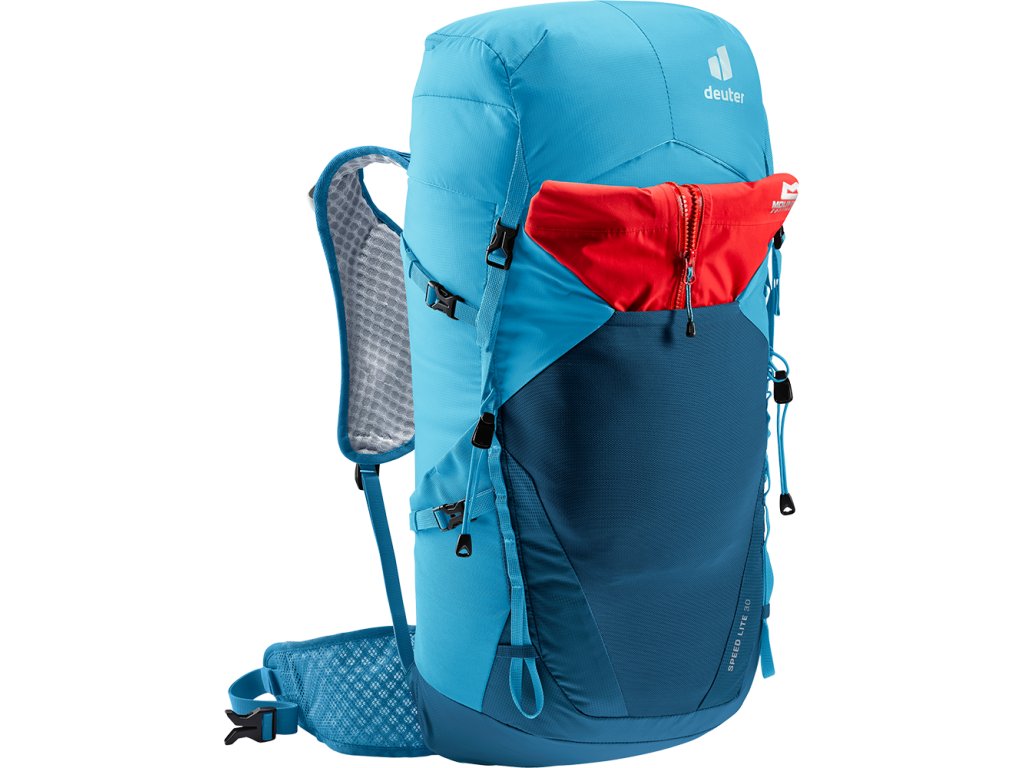 Turistický batoh Deuter Speed Lite 30 je vhodný na turistiku i trailový běh. Batoh je lehký a udržitelný díky zádovému systému deuter's Lite, perforovaným ramenním popruhům, pružným kyčelním ploutvím, přesně nastavitelnému hrudnímu popruhu a 100% recyklované, bluesign® certifikované tělové tkanině. Batoh má dále boční kompresní popruhy, navržené pro rychlou turistiku a trailový běh, účinně snižují kolébání zátěže a umožňují plný rozsah pohybu. Do kapsy na ramenních popruzích se vejde vše, co na trailu potřebujete. Větší předměty můžete uschovat do prostornější kapsy na víku.
