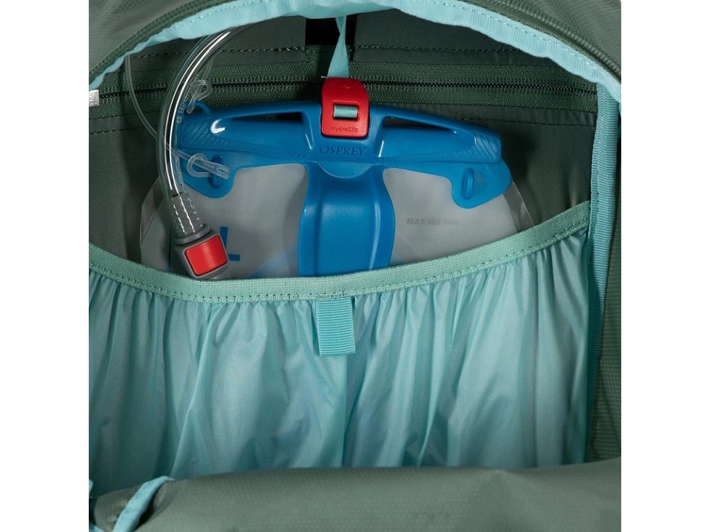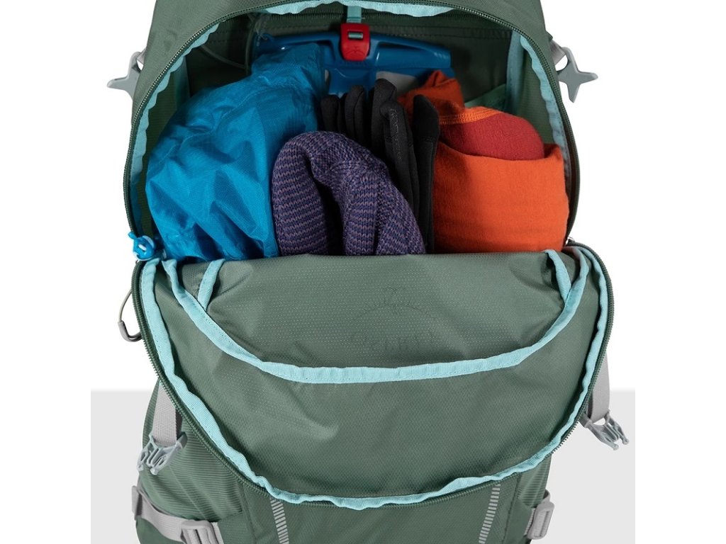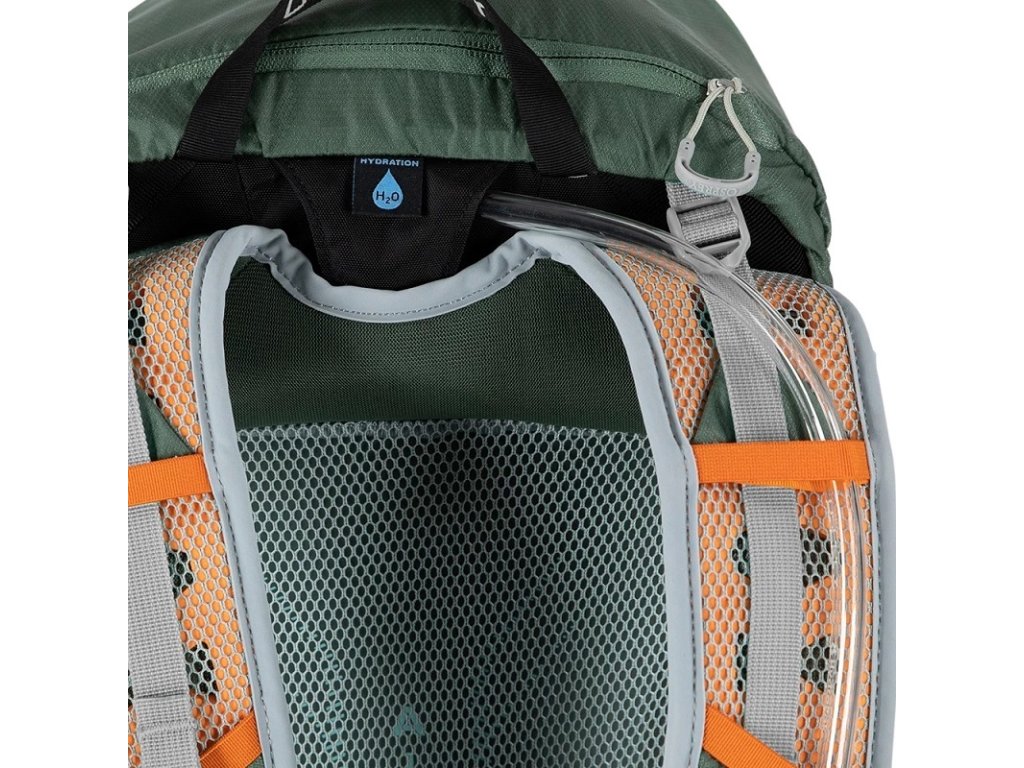 Na bocích jsou kapsy ze síťoviny PowerMesh™, které pojmou zhruba litrovou láhev, zároveň zde můžete upevnit trekové hole pomocí oček pro uchycení. Nechybí ani integrovaná odnímatelná pláštěnka a vstup na zip. Batoh je navíc kompatibilní s vodními rezervoáry Hydraulics™ a Hydraulics™ LT.