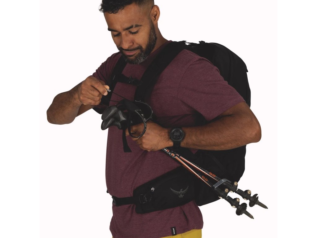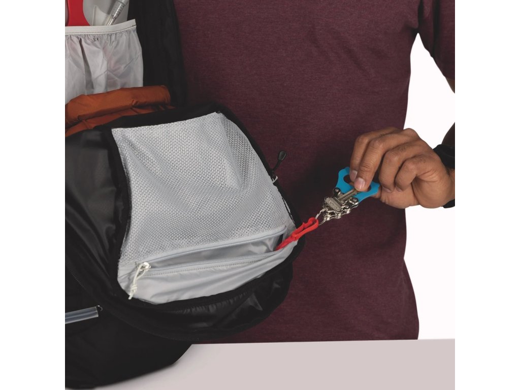 Přístup do batohu je za pomocí dvojitého zipu ve tvaru U, díky kterému máte perfektní přehled o věcech uvnitř hlavní komory. Vnitřní síťovaná kapsa na zip má klip na klíče. Další kapsa na zip se nachází na horním panelu, na předním panelu je velká pružná kapsa a na bocích jsou dvě pružné kapsy ze síťoviny. Dále jsou k dispozici dvě látkové kapsy na zip na bederním pásu. Popruhy z vnější strany umožňují připevnění cepínu. Při chůzi jistě oceníte rychloupínací systém pro trekové hole Stow-On-The-Go. Samozřejmostí jsou kompresní popruhy po stranách, které zmenší objem batohu na minimum.