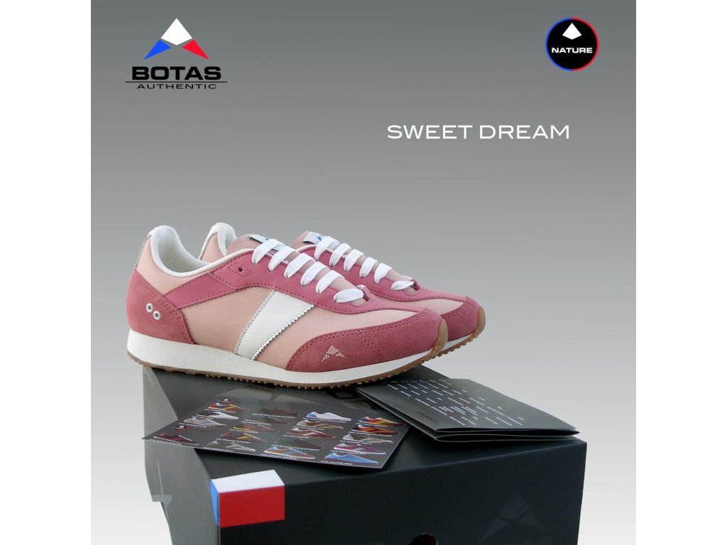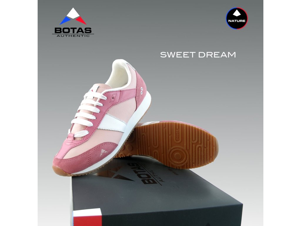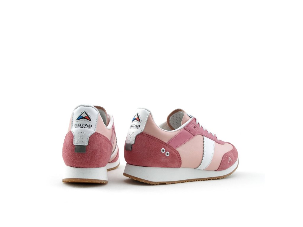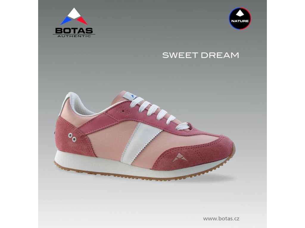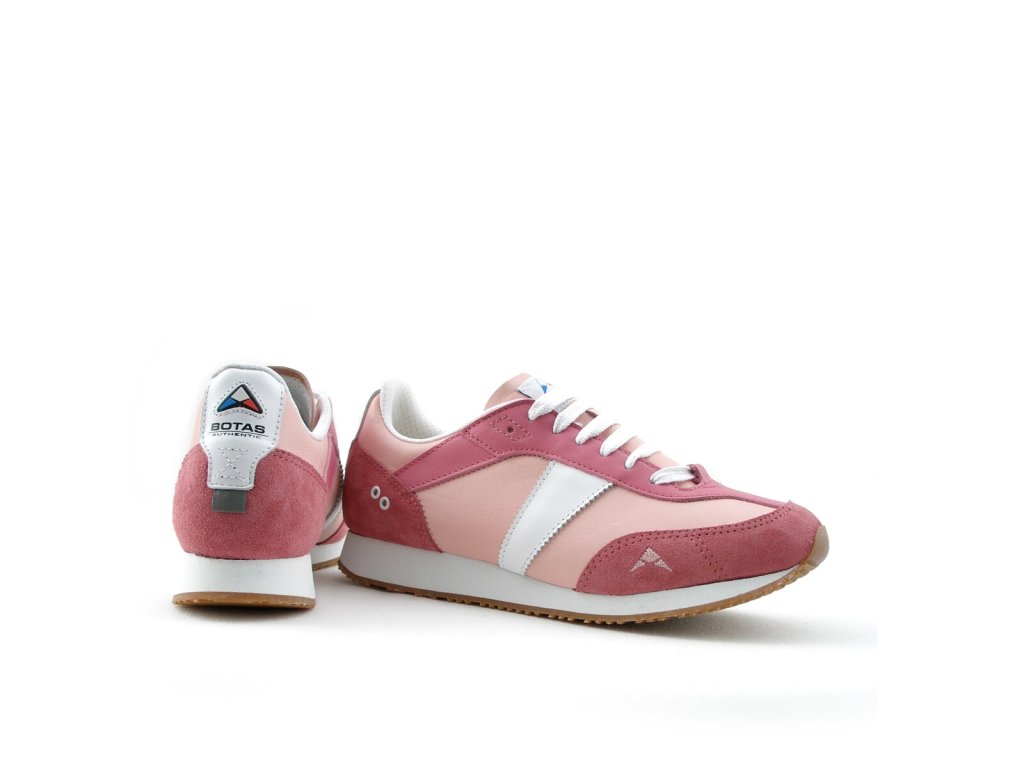 Celokožený svršek obuvi je kombinován z přírodních hladkých a štípenkových usní v růžovo-bílém designu. Vnitřek obuvi tvoří měkký bílý textilní materiál a anatomicky tvarovaná třívrstvá vyměnitelná vkládací stélka bílé barvy s šedým potiskem grafického loga BOTAS AUTHENTIC. Zvýšená odlehčená podešev umocňuje výborný pocit při chůzi i v městském prostředí.