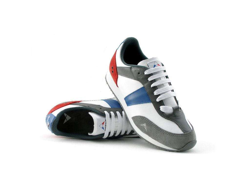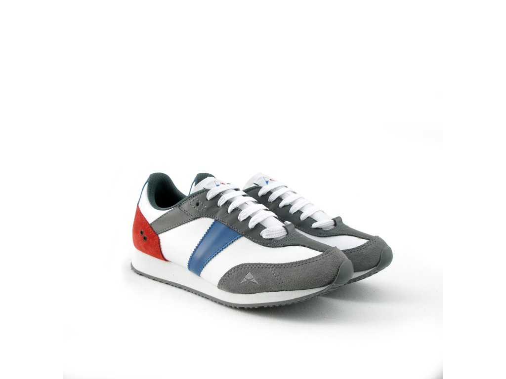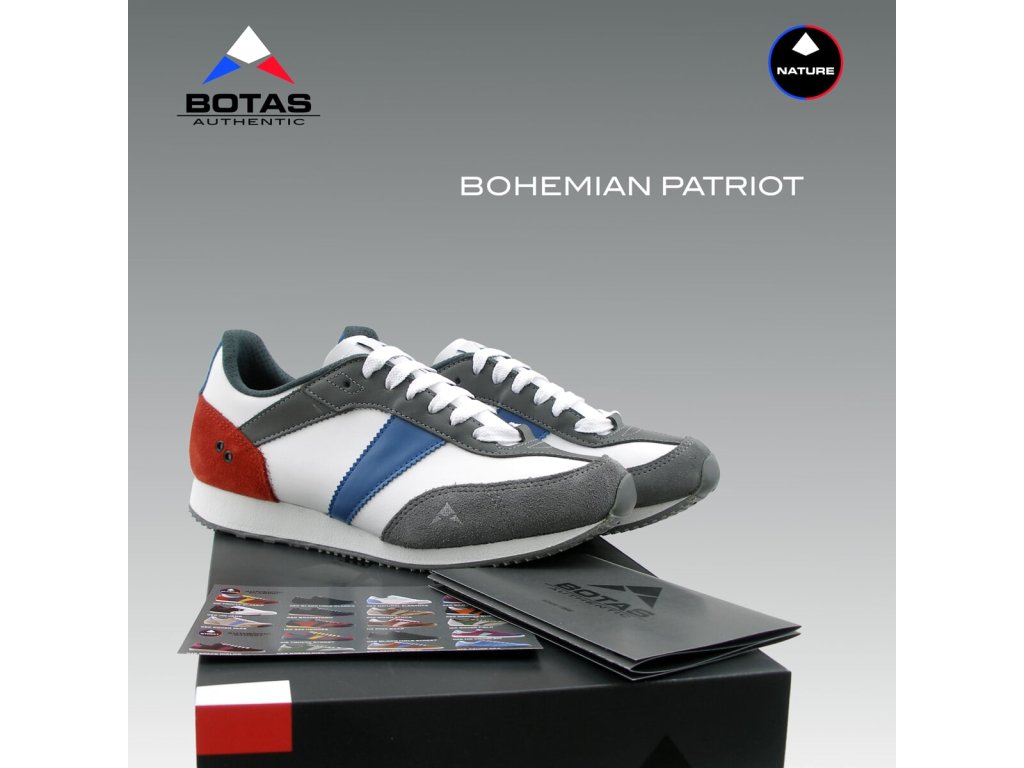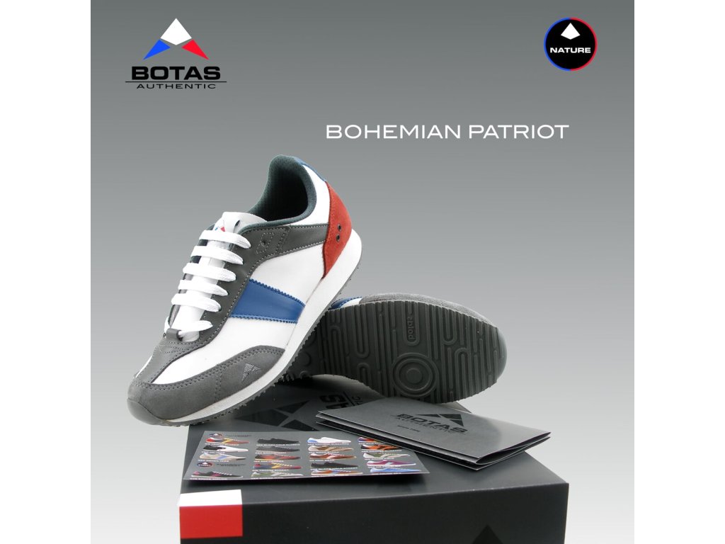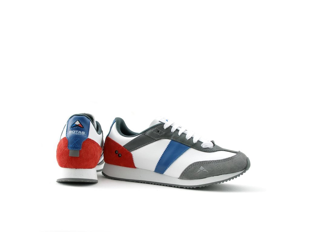 Celokožený svršek obuvi je kombinován z přírodních hladkých a štípenkových usní v bílo-červeno-modro-šedém designu. Vnitřek obuvi tvoří měkký šedý textilní materiál a anatomicky tvarovaná třívrstvá vyměnitelná vkládací stélka šedé barvy s bílým potiskem grafického loga BOTAS AUTHENTIC. Zvýšená odlehčená podešev umocňuje výborný pocit při chůzi i v městském prostředí.