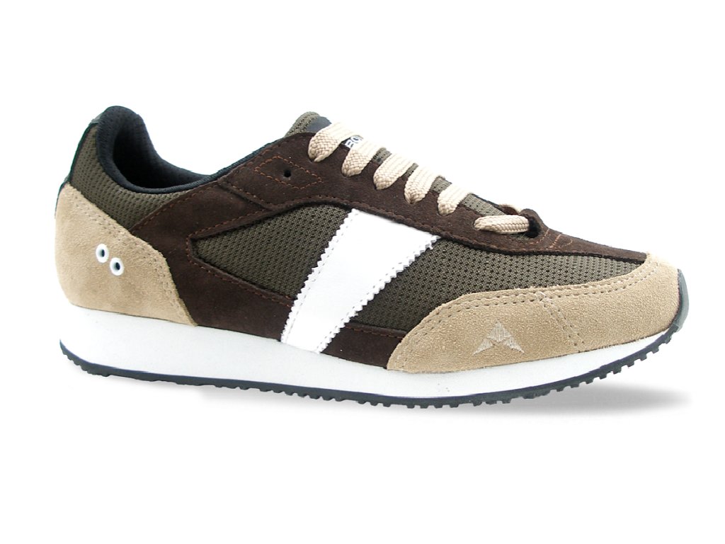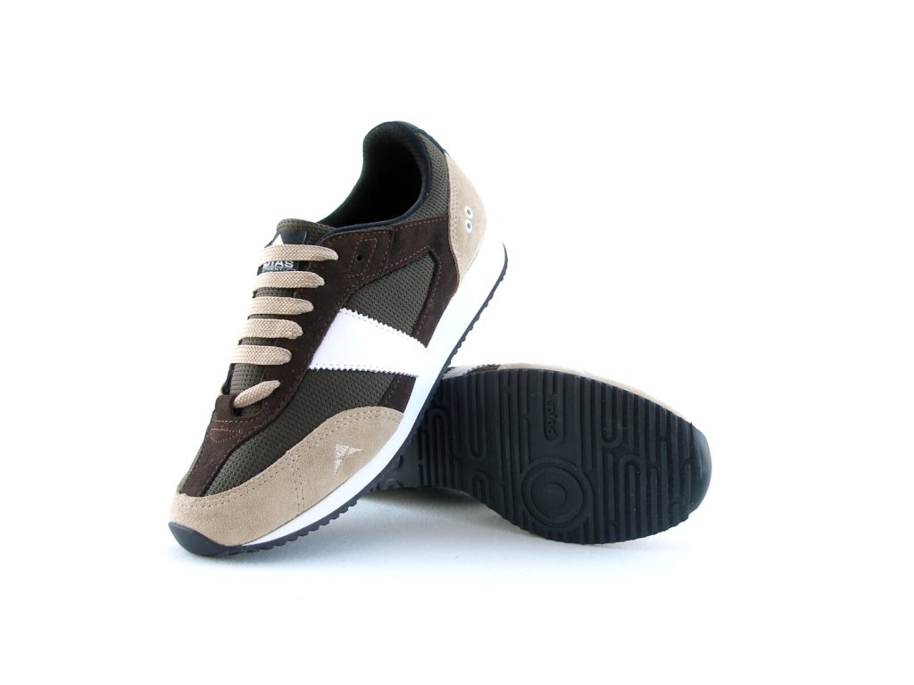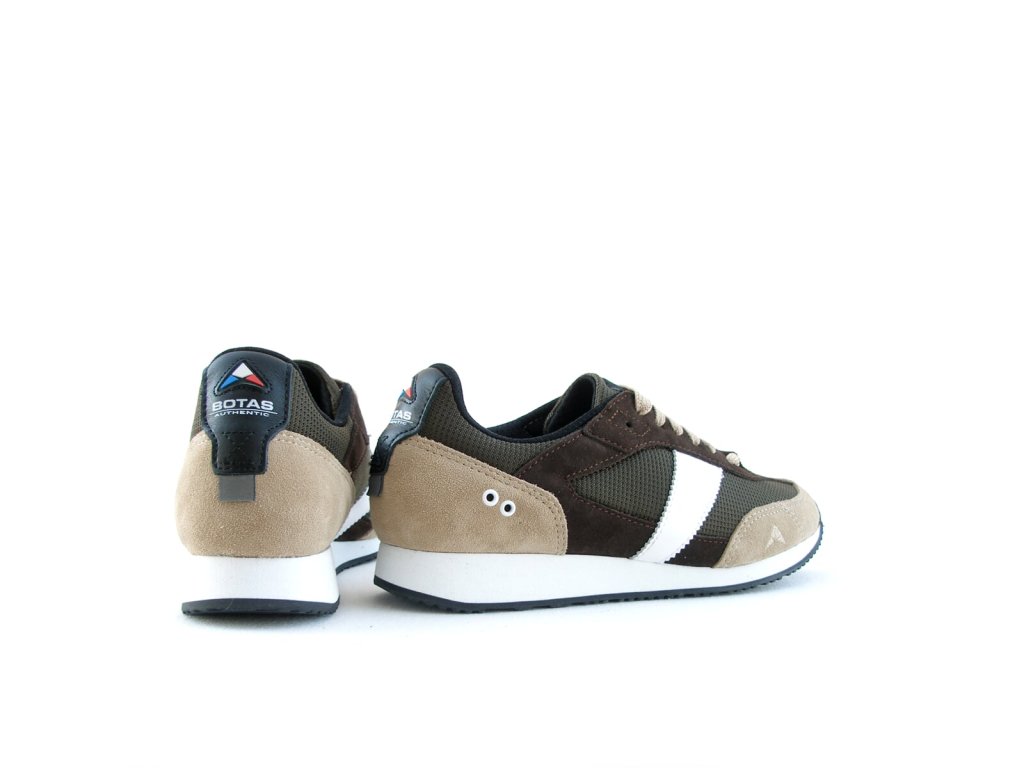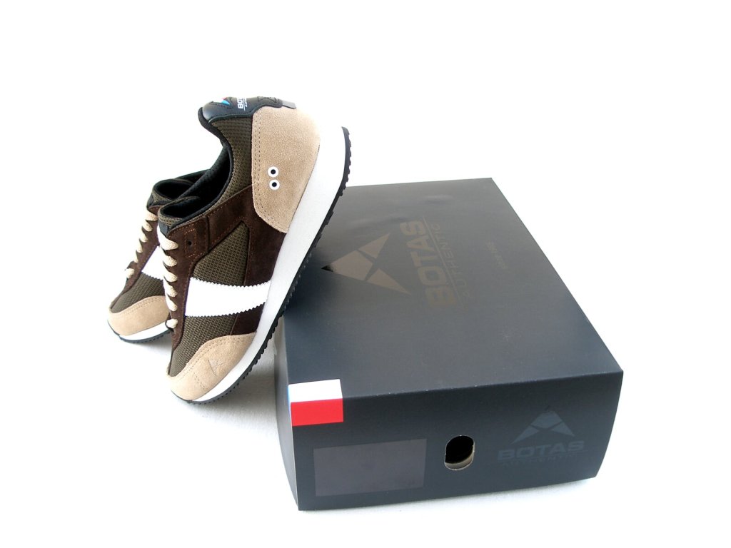 Svršek obuvi je kombinován ze vzdušného textilního materiálu a štípenkových usní v hnědo-béžovo-bílém designu. Vnitřek obuvi tvoří měkký černý textilní materiál a anatomicky tvarovaná třívrstvá vyměnitelná vkládací stélka černé barvy s bílým potiskem grafického loga BOTAS AUTHENTIC. Zvýšená odlehčená bílo-černá podešev umocňuje výborný pocit při chůzi i v městském prostředí.