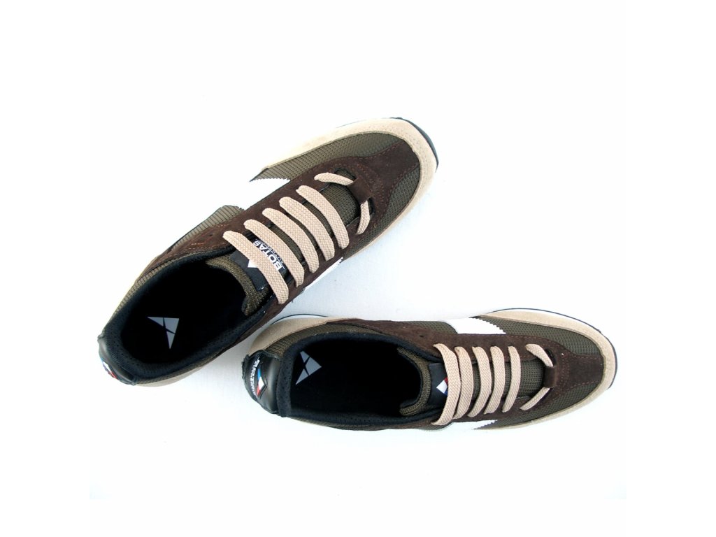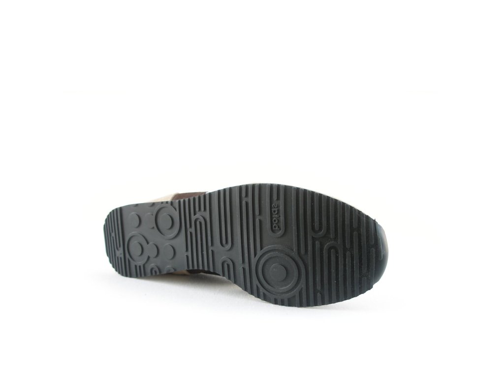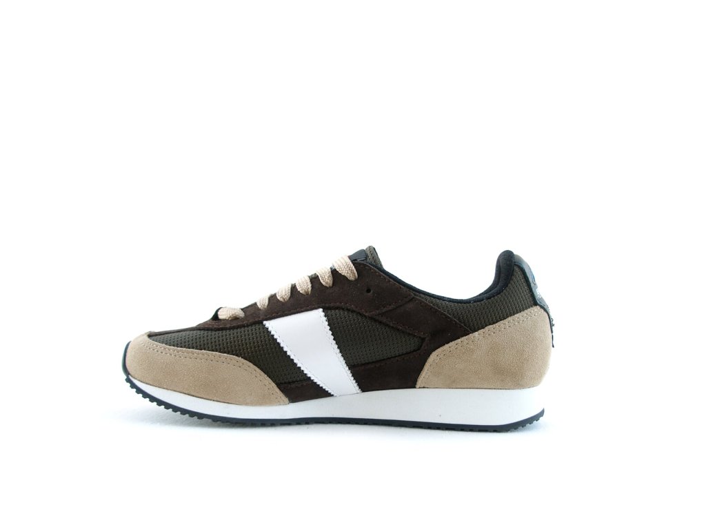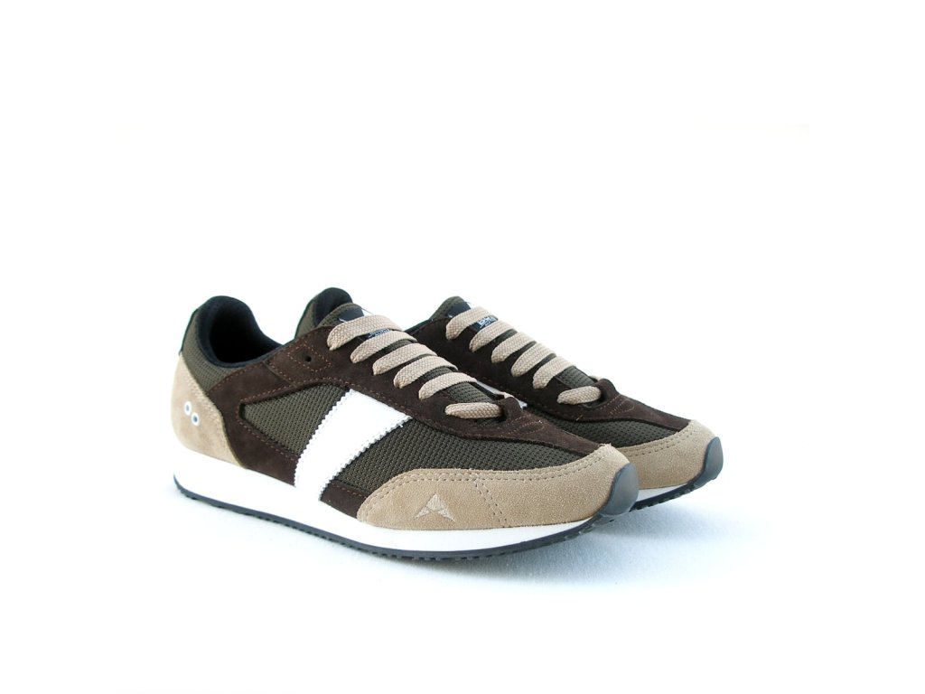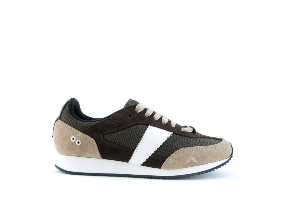 Svršek obuvi je kombinován ze vzdušného textilního materiálu a štípenkových usní v hnědo-béžovo-bílém designu. Vnitřek obuvi tvoří měkký černý textilní materiál a anatomicky tvarovaná třívrstvá vyměnitelná vkládací stélka černé barvy s bílým potiskem grafického loga BOTAS AUTHENTIC. Zvýšená odlehčená bílo-černá podešev umocňuje výborný pocit při chůzi i v městském prostředí.