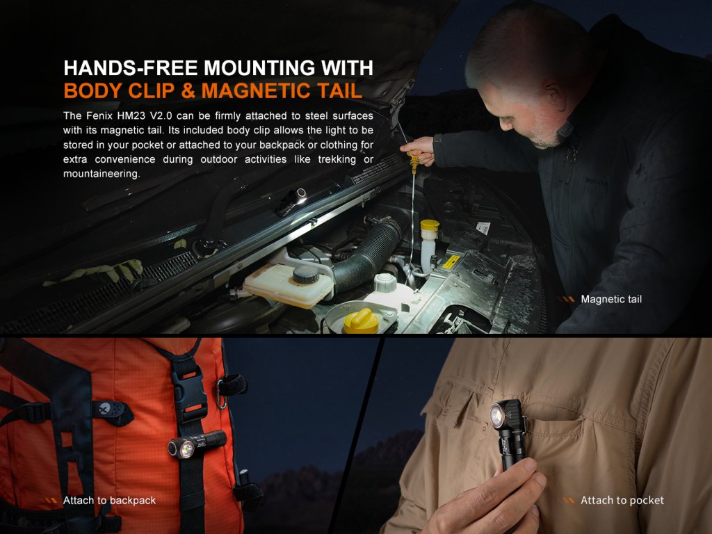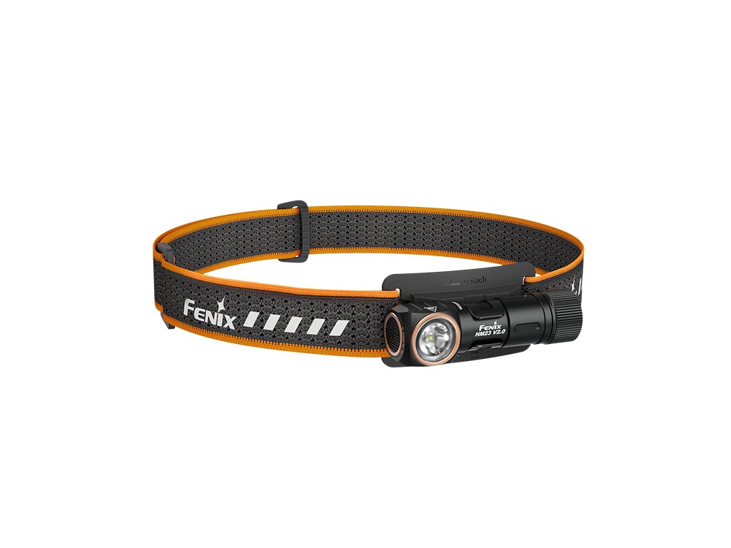 Kompaktní LED čelovka Fenix HM23 V2.0 nabízí světelný tok až 300 lumenů (ANSI) a dosvit 88 metrů. K napájení používá jednu tužkovou AA baterii, se kterou dosahuje výdrž až 100 hodin v nejnižším režimu (více než 4 dny). Světelným zdrojem je špičková bílá LED Luminus SST-20 a dvojice červených LED. Celokovová konstrukce zajišťuje vysokou odolnost, optimální chlazení a zároveň je plně vodotěsná dle standardu IP68 až do hloubky 2 metry pod vodou. Praktičnost čelovky zvyšuje možnost vyjmout světlo z hlavového držáku a používat ji i jako malou kapesní svítilnu. Navíc je čelovka opatřena ocelovou snímatelnou sponou, takže ji jednoduše připnete na kapsu či popruh. Koncovka svítilny je magnetická, takže ji lze snadno uchytit na cokoliv železného. Čelovka nabízí celkem tři režimy výkonu v režimu bílého světla a elektroniku s funkcí prodloužení výdrže, v režimech 300 a 50 lumenů postupně snižuje výkon pro dosažení delší doby svícení (viz. graf výdrží v jednotlivých režimech). Červené světlo lze spustit v režimu stálého svícení nebo blikačky (obojí o síle 5 lumenů).