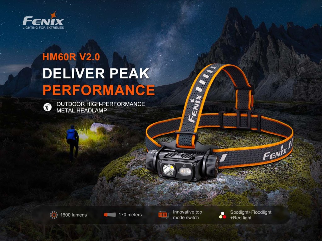 Fenix HM60R V2.0 je vysoce výkonná nabíjecí čelovka, která v hlavním reflektoru nabízí světelný tok až 1600 lumenů s dosvitem 170 metrů. Druhý reflektor s výkonem až 350 lumenů má světelnou stopu velmi širokou a plynulou s neutrálním odstínem světla s vysokým indexem kvality podání barev CRI >90 (Color Rendering Index). Mezi reflektory se přepíná inovativním posuvným voličem na horní straně čelovky s možností jejího uzamknutí. Čelovka disponuje také červeným světlem s výkonem až 20 lumenů. Součástí balení je i nabíjecí Li-ion akumulátor typu 18650 s kapacitou 4000 mAh, který se nabíjí přímo v čelovce přes USB-C konektor. Vzhledem k výbavě je vhodná pro profesionální použití, různorodé sportovní aktivity (turistika, kempování, běh, cyklistika, lyžování...), do podzemí, pro rybáře a další použití. Zaručeně vám skvěle poslouží v každé situaci! Celokovová konstrukce zajišťuje vysokou odolnost, optimální chlazení a zároveň je plně vodotěsná dle standardu IP68 až do hloubky 2 metry pod vodou.