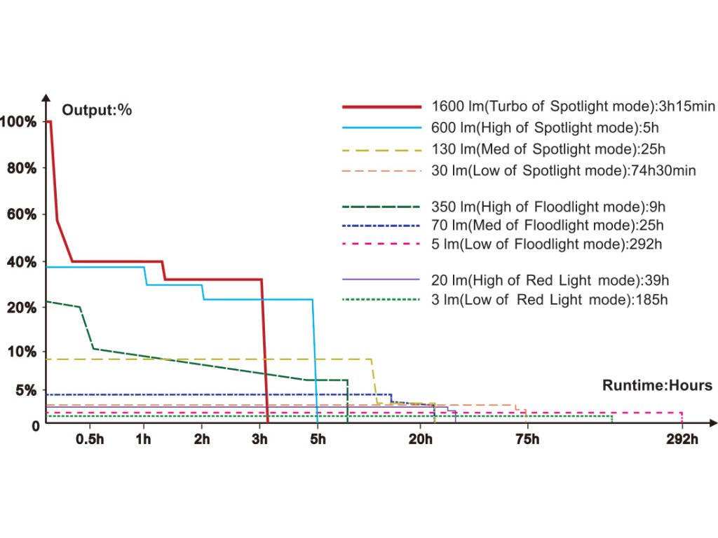 - Široký reflektor: 350 lumenů (9 hodin) -> 70 lumenů (25 hodin) -> 5 lumenů (292 hodin) -> červená 20 lumenů (39 hodin) -> červená 3 lumeny (185 hodin) -> červené blikání 3 lumeny (370 hodin).