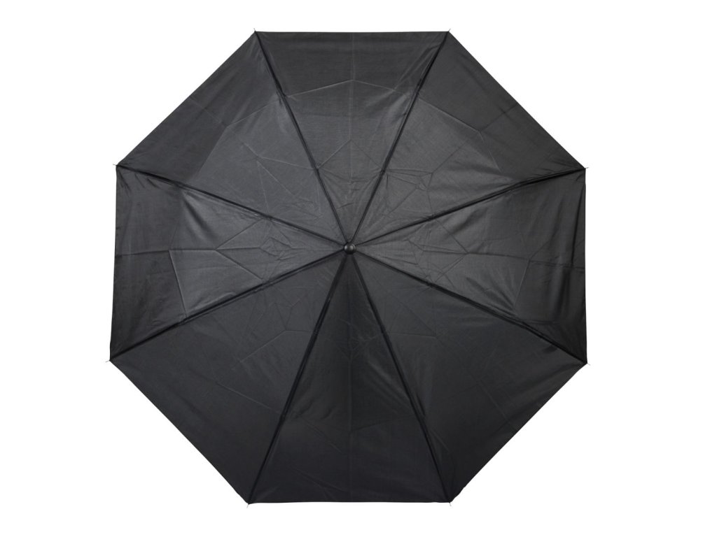 Skládací polyesterový deštník s trojdílnými kovovými rameny, kovovou konstrukcí, černou plastovou rukojetí. Zapínání na suchý zip. Rozměr: O96 cm.