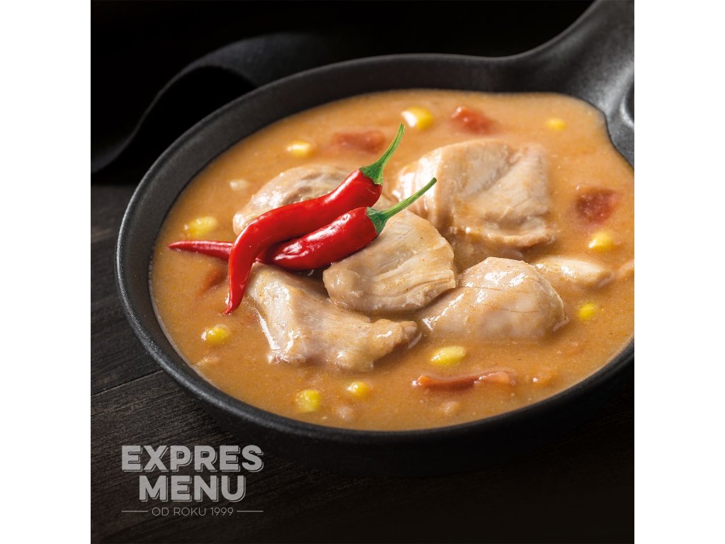 Složení: kuřecí maso (32 %), drůbeží vývar (voda, drůbeží maso a kosti), rajčata, rajčatový protlak (voda, rajčatový protlak, sůl), řepkový olej, rýžová mouka, kukuřičná mouka, fazole, kukuřice, cibule, sůl kamenná, chilli.