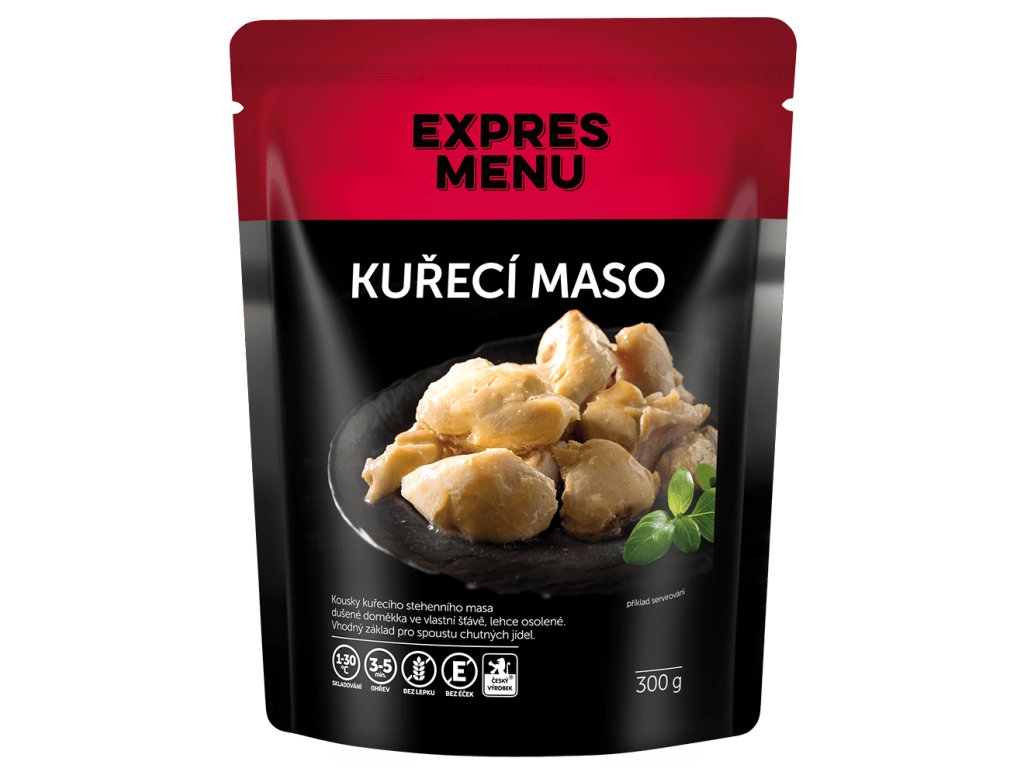 Kousky kuřecího stehenního masa dušené doměkka ve vlastní šťávě, lehce osolené. Vhodný základ pro spoustu chutných jídel.