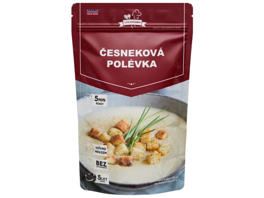 Lyo Česneková polévka – plná chuť domácí polévky, kterou si můžete vychutnat kdykoliv a kdekoliv. Díky šetrnému mrazem sušení si zachovává své nutriční hodnoty i bohatou chuť – bez konzervantů a chemie, přesně tak, jak ji máme rádi.