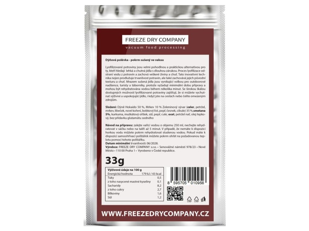 Lyo Dýňová polévka – Vychutnejte si lahodnou a výživnou dýňovou polévku kdykoli a kdekoli! Díky šetrnému sušení mrazem si zachovává své nutriční hodnoty i bohatou chuť – bez konzervantů a chemie, přesně tak, jak ji máme rádi.