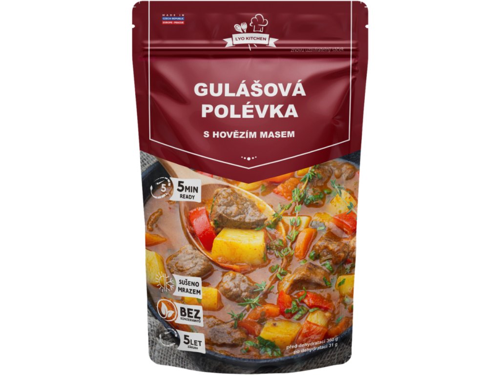 Gulášová polévka s hovězím masem (lyofilizovaná)– plná chuť domácí polévky, kterou si můžete vychutnat kdykoliv a kdekoliv. Díky šetrnému mrazem sušení si zachovává své nutriční hodnoty i bohatou chuť – bez konzervantů a chemie, přesně tak, jak ji máme rádi.