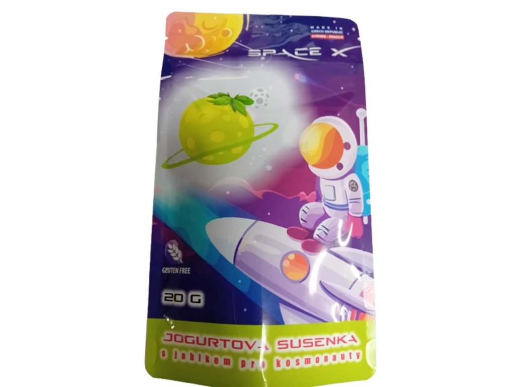 Složení: Lyofilizovaný jogurt (mléko, smetana, sušené mléko, jogurtová a probiotická kultura), cukr, lyofilizované jablko.