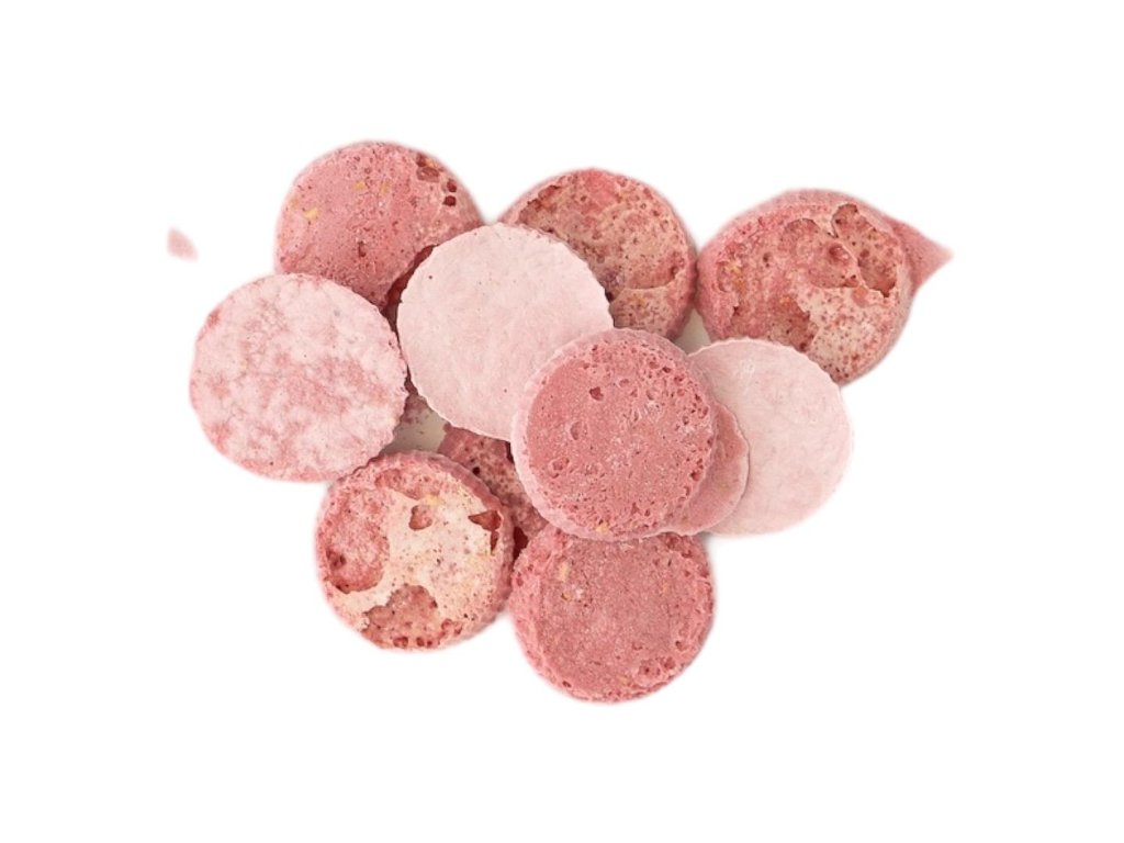 Křupavá lyofilizovaná jogurtová sušenka, která spojuje jemnou chuť jogurtu s příchutí jahody.