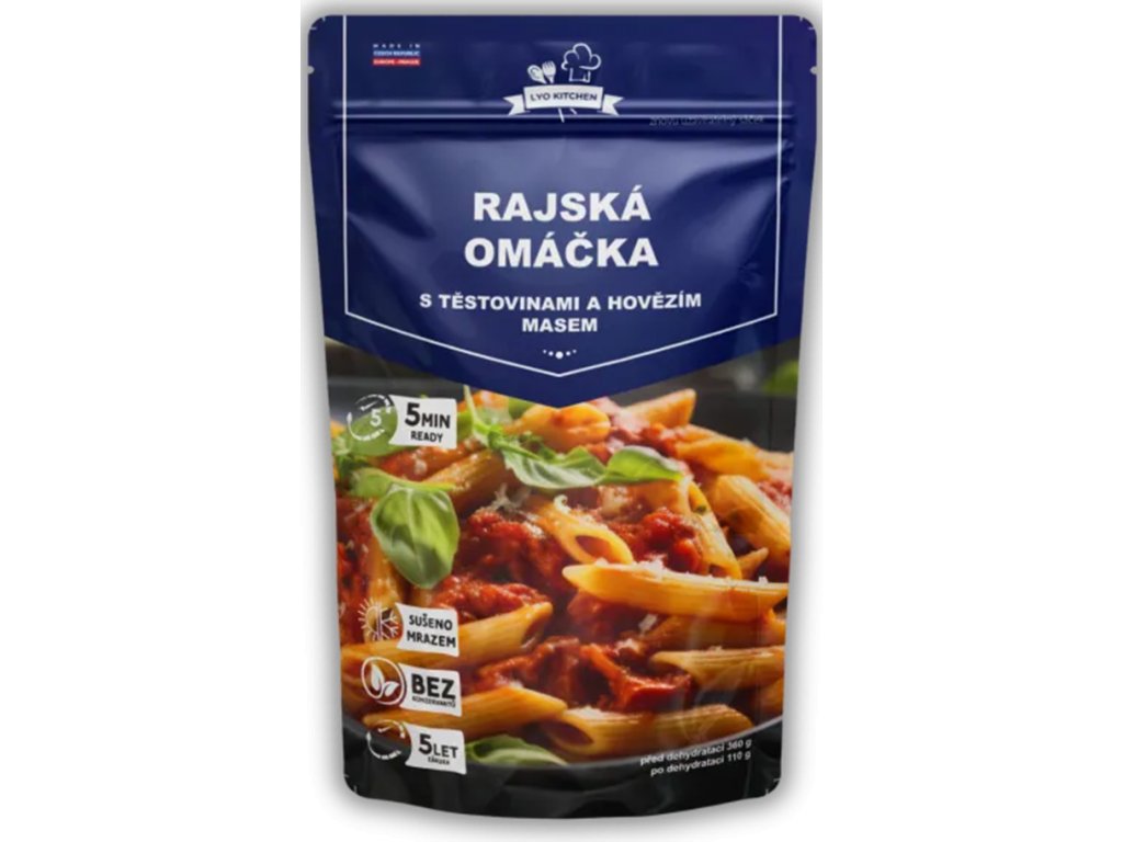 Lyo Rajská omáčka s těstovinami a hovězím masem - tradiční jídlo s jemně sladkou rajskou omáčkou, šťavnatými kousky hovězího masa a těstovinami.