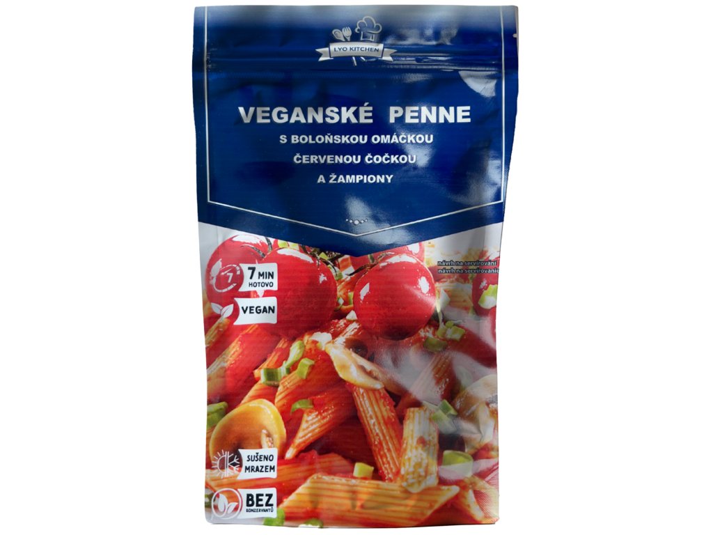 FDC Lyo veganské penne s boloňskou omáčkou, červenou čočkou a žampiony je rostlinná alternativa oblíbené klasiky, která potěší nejen vegany. Penne jsou zalité bohatou rajčatovou omáčkou, v níž najdete červenou čočku, žampiony a směs bylinek. Chuťově vyvážené, syté a přirozeně bez živočišných produktů – ideální pro ty, kdo chtějí lehké, ale plnohodnotné jídlo na cesty i do práce.