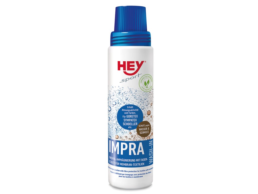 HEY SPORT® Impra Wash-In je impregnace, která se přidává k prádlu při praní a zajišťuje plnou ochranu proti vodě při zachování prodyšnosti. Vhodné zejména pro textilie s membránami i pro textilie s nanotechnologiemi. Perfektní ochrana vláken. HEY SPORT® Impra Wash-In impregnuje všechny textilie z přírodních a syntetických vláken. Udržuje aktivní prodyšnost a svěží barvy.