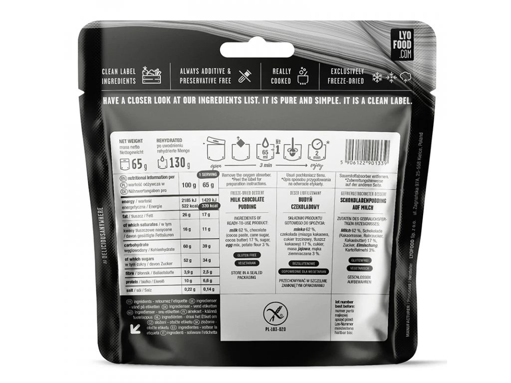 Každý, i sebemenší úspěch si zaslouží odměnu. Proto jsme vytvořili náš mrazem sušený čokoládový pudink! Čokoládový pudink LYO, obohacený o více čokolády a krémovější než kdy dříve, rozzáří vaše chuťové pohárky. Přidejte hrst naší lyofilizované směsi lesních plodů nebo višní a vytvořte dokonalý venkovní dezert.
