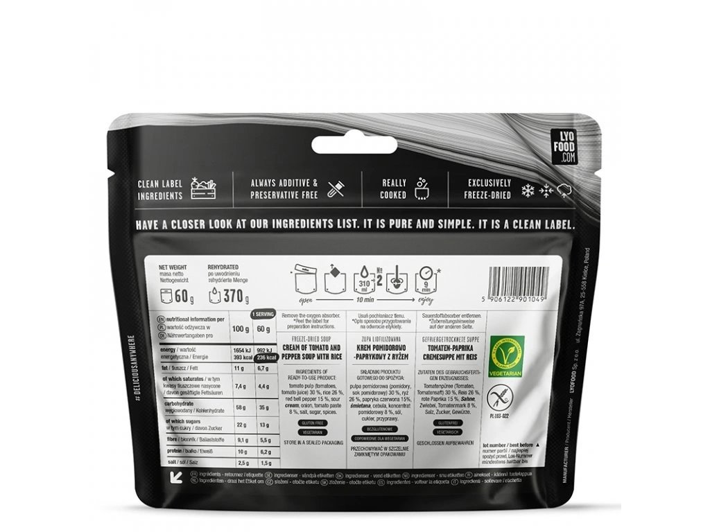 V balení nejsou žádné umělé přísady, žádné přidané cukry, žádný palmový olej a žádné konzervační látky. Jídlo je vyrobeno ze 100% přírodních surovin. Doba spotřeby jsou cca 4 roky.