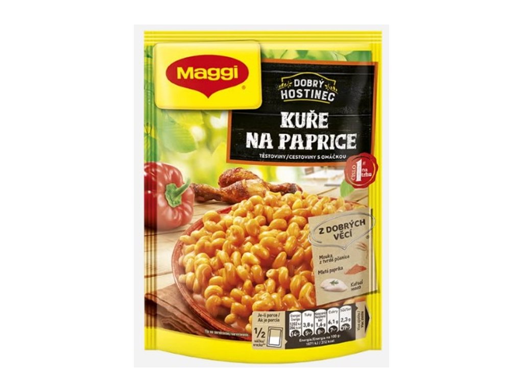 Pokud hledáte chutné jídlo třeba na cesty, které bude hotové raz dva, máme pro vás tip. Lahodné kuře na paprice jako od maminky. Hodí se i pokud máte chuť na tradiční českou kuchyni, ale nemáte mnoho času na její přípravu. Maggi Dobrý hostinec kuře na paprice je chuťově vyváženou kombinaci těstovin, lahodné omáčky a koření.