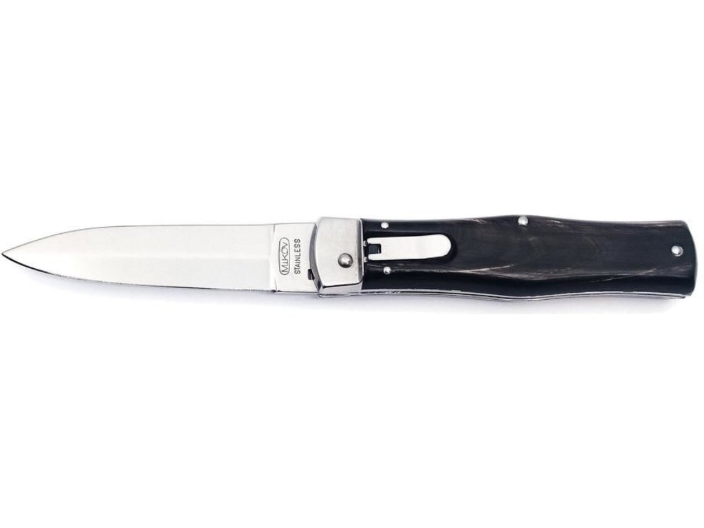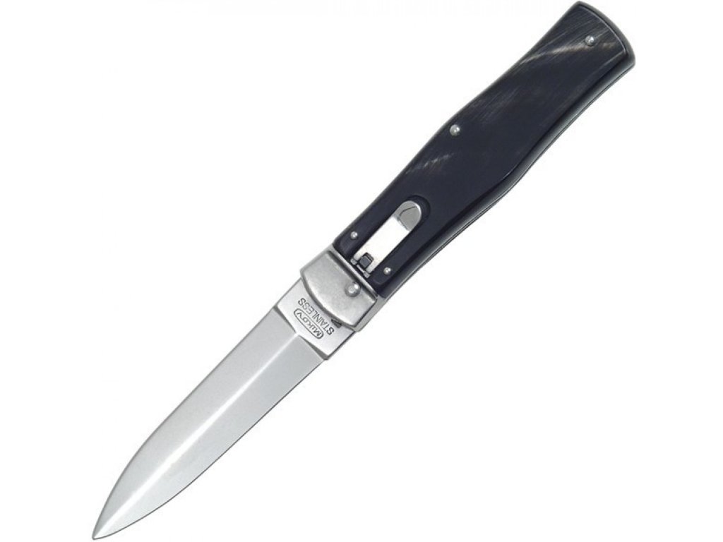 Vyhazovací nůž Mikov Predator 241-NR-1/KP má čepel vyrobenou z nerezové oceli 420. Střenka vyrobená z buvolího rohu má tvar, který perfektně padne do ruky. Nůž je dodáván včetně koženého pouzdra.