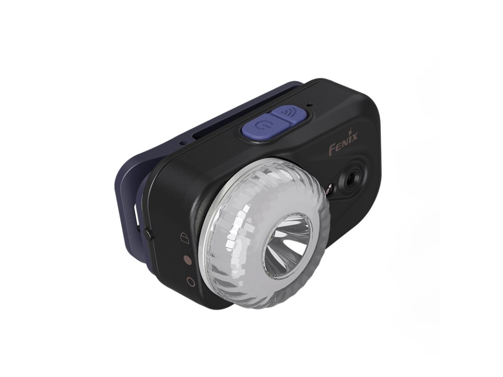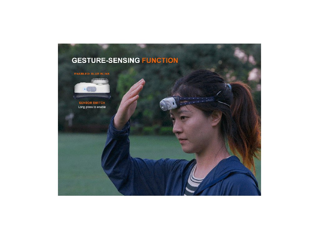 Ovládání čelovky gesty - Při zapnuté čelovce stiskněte a podržte senzorový spínač, čelovka třikrát bíle zabliká a indikátor funkce snímání gest bude modře blikat, což značí, že tato funkce je aktivována. Po aktivaci této funkce můžete čelovku mávnutím ruky zapnout/vypnout. Při zapnuté čelovce znovu stiskněte a podržte senzorový spínač pro deaktivaci této funkce. Vypnutí nebo zamknutí čelovky deaktivuje funkci snímání gest. Pokud chcete tuto funkci používat, znovu ji aktivujte po zapnutí čelovky. Dosah snímání je přibližně do 10 cm před čelovkou a může se mírně lišit v závislosti na materiálu a barvě snímaného objektu, okolním světle, zvoleném výkonu svícení a rychlosti mávnutí. Funkce snímání gest využívá infračervený senzor. Pokud se v dosahu snímání před čelovkou pohne jiný objekt než vaše ruka, čelovka se také může zapnout/vypnout.
