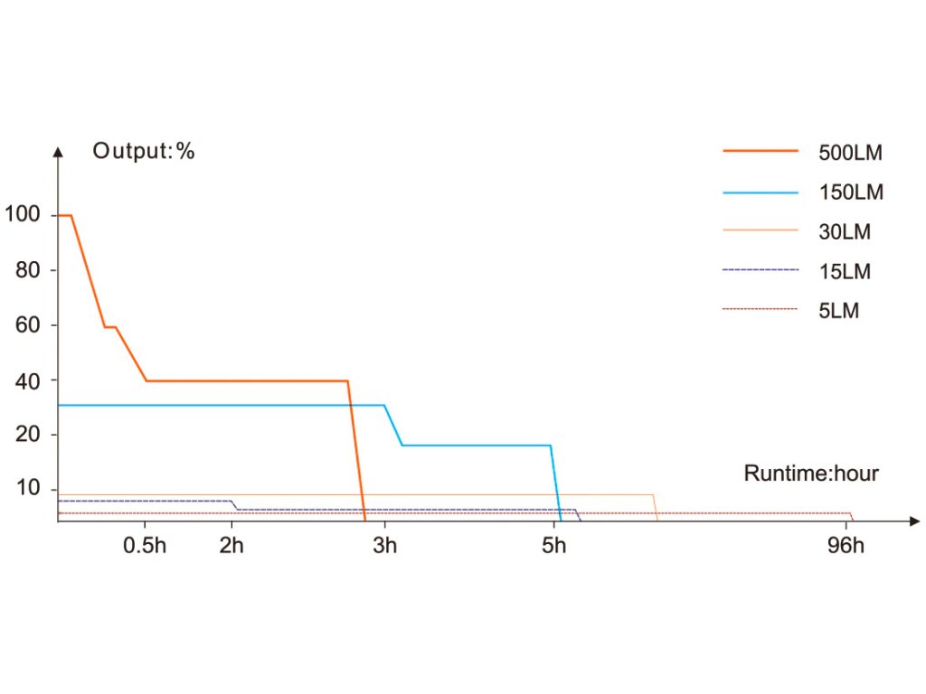- Čtyři režimy bílého světla: 500 lumenů (2,8 hodiny) -> 150 lumenů (5,5 hodiny) -> 30 lumenů (23 hodin) -> 5 lumenů (96,8 hodiny).