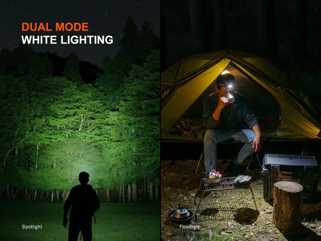 Široký reflektor: 350 lumenů (3,6 hodiny) -> 70 lumenů (17,6 hodin) -> 5 lumenů (141,2 hodiny).
