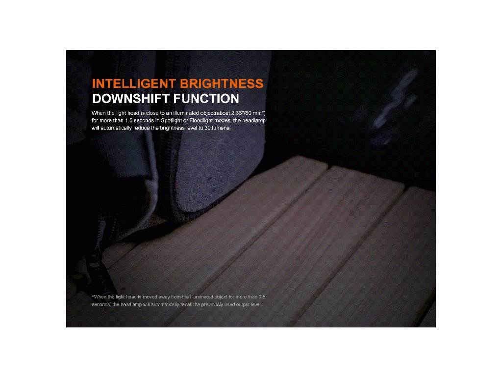 Inteligentní senzor přiblížení - Čelovka má vestavěný bezpečnostní obvod. Když se reflektor přiblíží k osvětlovanému objektu na méně než 6 cm a déle než 1,5 sekundy, tak automaticky sníží výkon na 30 lumenů, aby se zabránilo přehřátí a případnému popálení nebo poškození osvětleného předmětu. Když se svítilna vzdálí od osvětleného objektu na déle než 0,8 sekundy, tak automaticky obnoví dříve použitý režim výkonu.