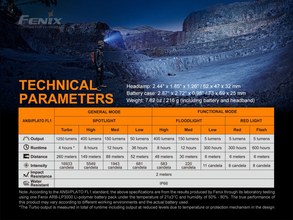 Všechny parametry čelovky (světelný tok, doba provozu na baterie, vodotěsnost, dosvit a nárazuvzdornost) jsou změřeny v souladu s normou ANSI/NEMA FL 1-2009.