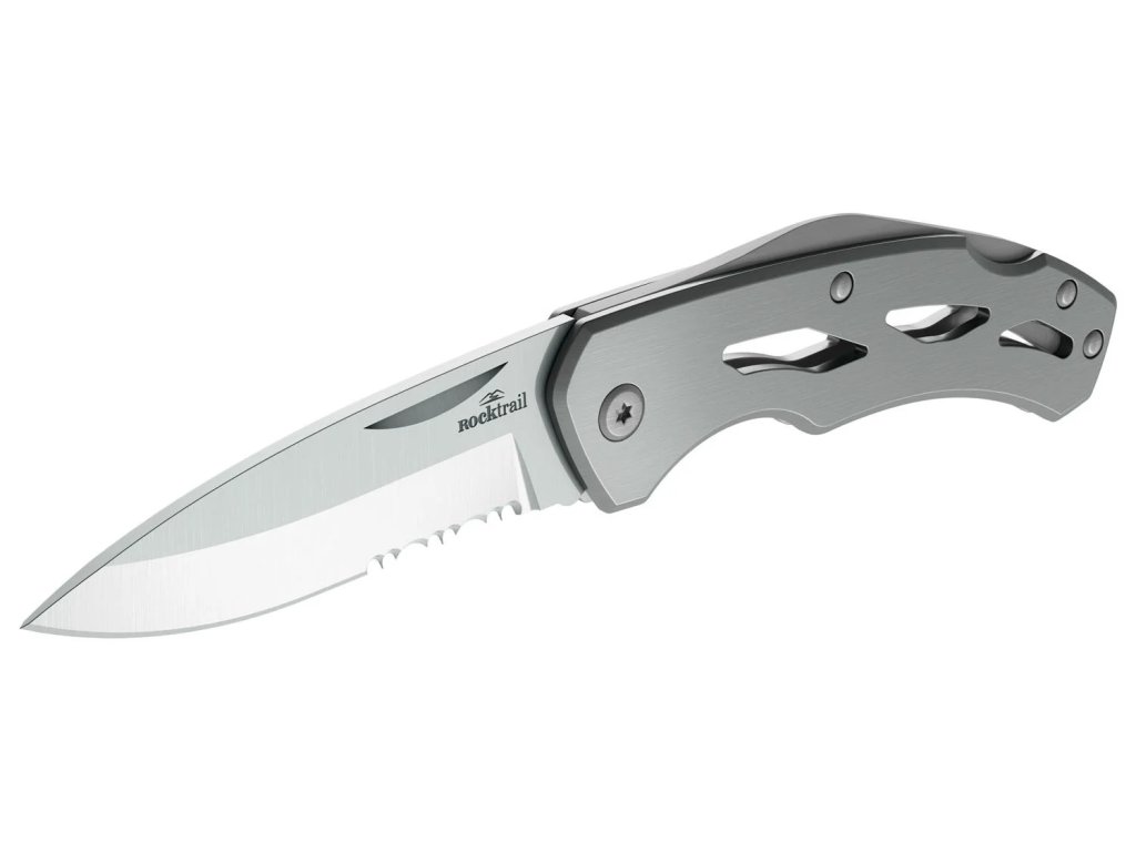 Kapesní nůž Rocktrail je spolehlivým nástrojem při turistice, kempování i každodenním použití. Vyroben z nerezové oceli, kombinuje odolnost s kompaktním tvarem. Částečně zoubkované ostří si poradí s různými materiály a vestavěný zámek zajišťuje bezpečnost. Sada obsahuje praktické pouzdro na opasek vyrobené z recyklovaných materiálů. Lehký, praktický a stylový – nutnost pro aktivní lidi!