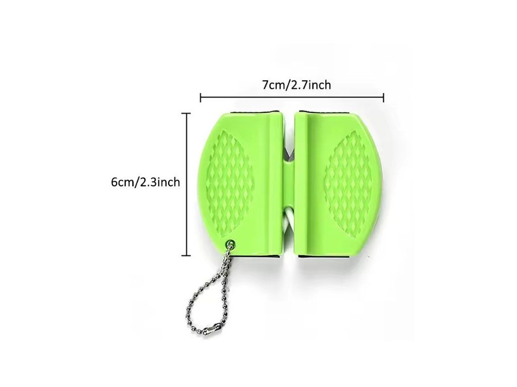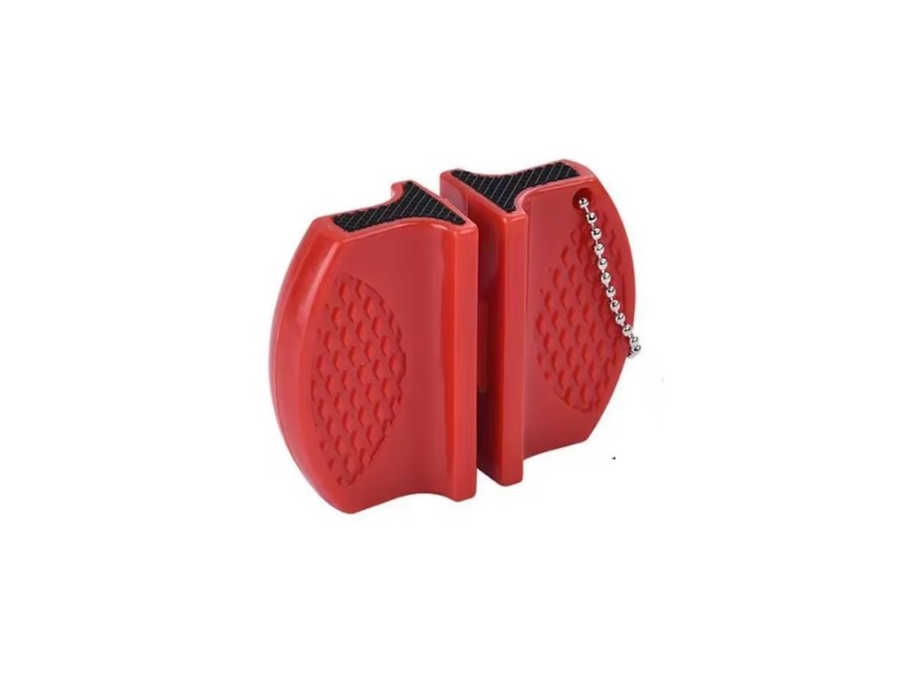 Malý outdoorový ostřič na nože s řetízkem k broušení "nahrubo" pomocí dvojice karbidových plátků a jemnému finálnímu naostření pomocí plátků keramických