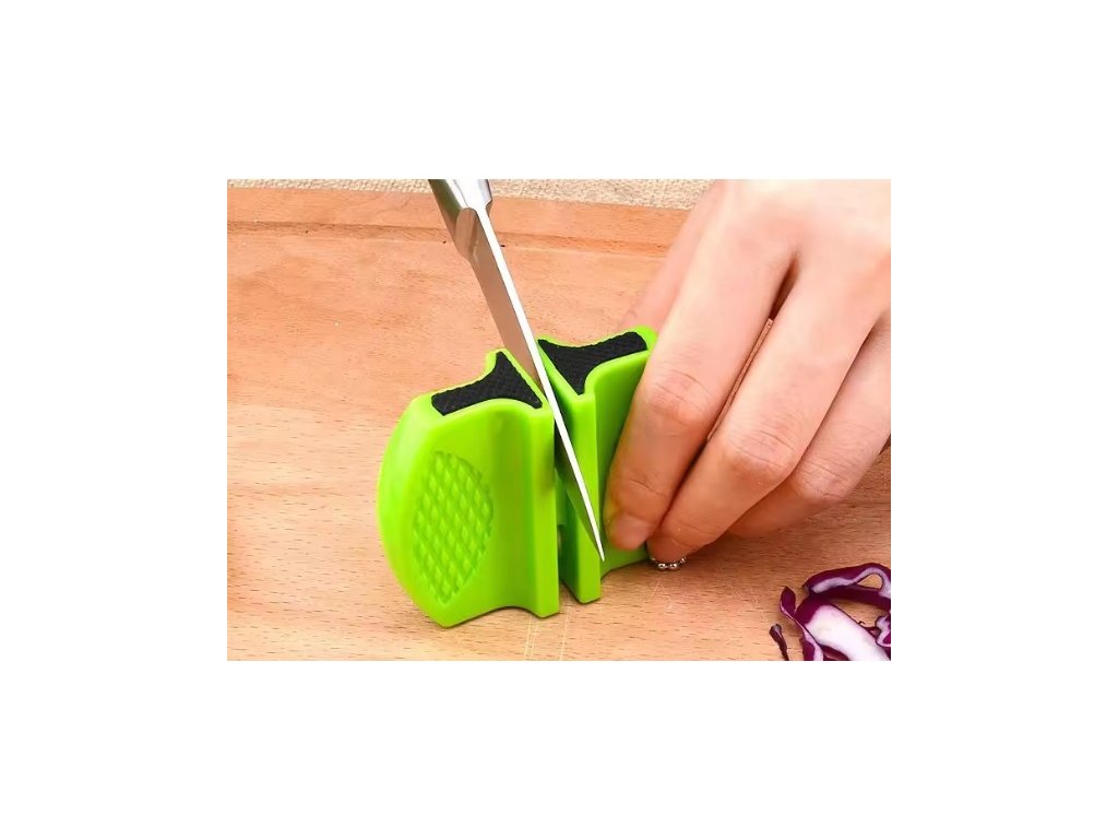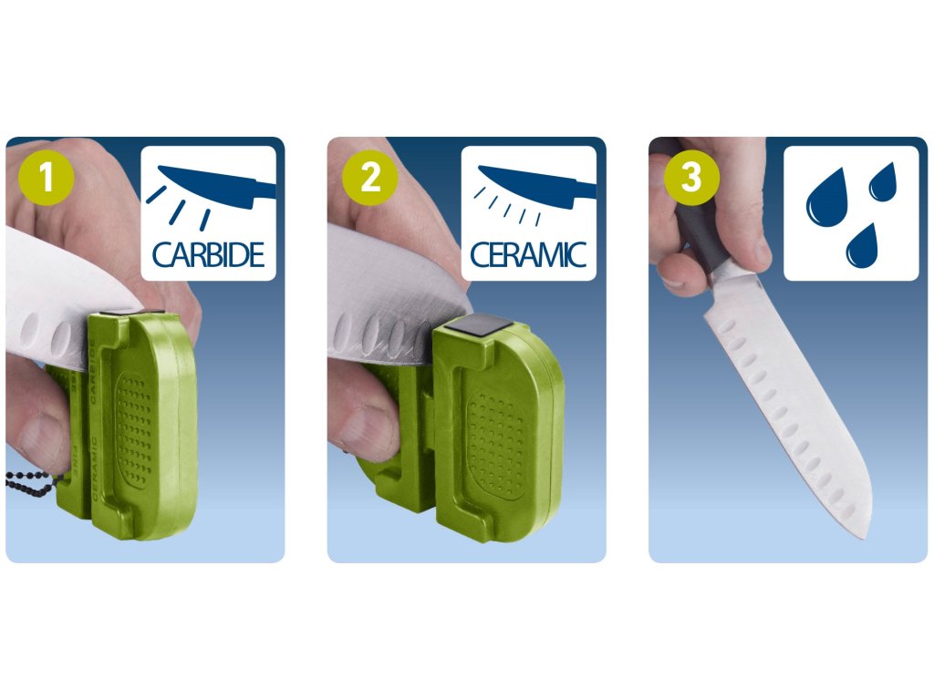 Brousek se dvěma brusnými plochami: karbidová pro hrubé broušení a keramická pro jemné dobroušení ostří.