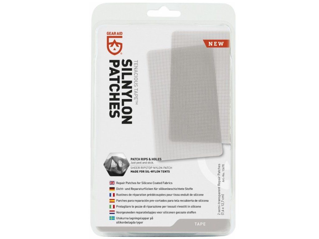 Se záplatou Tenacious Tape® Silnylon Patches od značky Gear Aid snadno a rychle opravíte jakékoliv kempingové a outdoorové vybavení, ať už se jedná o batoh, stan, hamaku či karimatku. V sadě se nachází 2 záplaty s rozměry 7,6 cm x 12,7 cm, které jsou vyrobené z velmi pevné a odolné nylonové tkaniny, která je doplněna o Ripstop technologii. Tato technologie zvyšuje tržnou pevnost materiálu. Prakticky to funguje tak, že se trhlina zasekne o zesílené vlákno a nepokračuje. Lepidlo je poté na bázi silikonu.