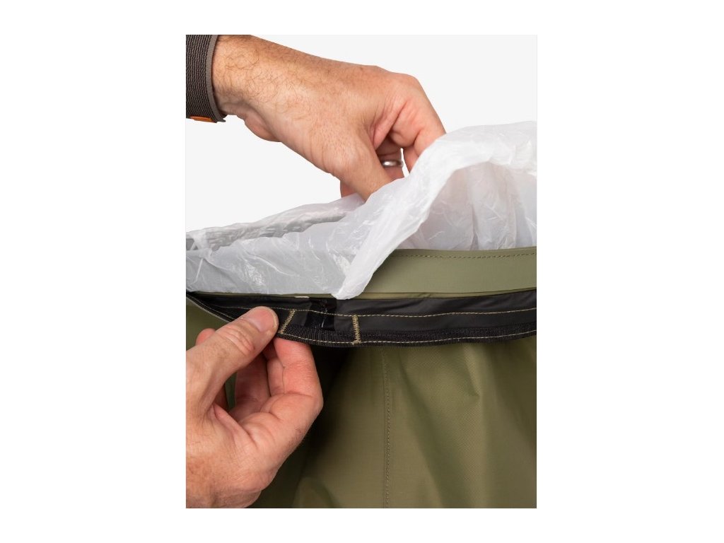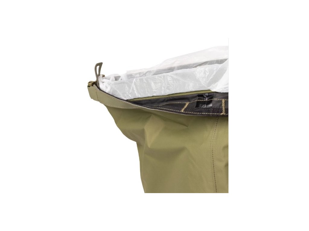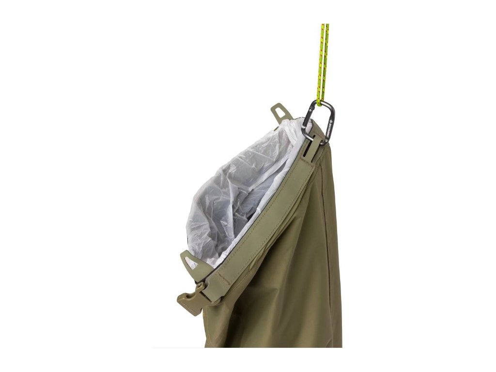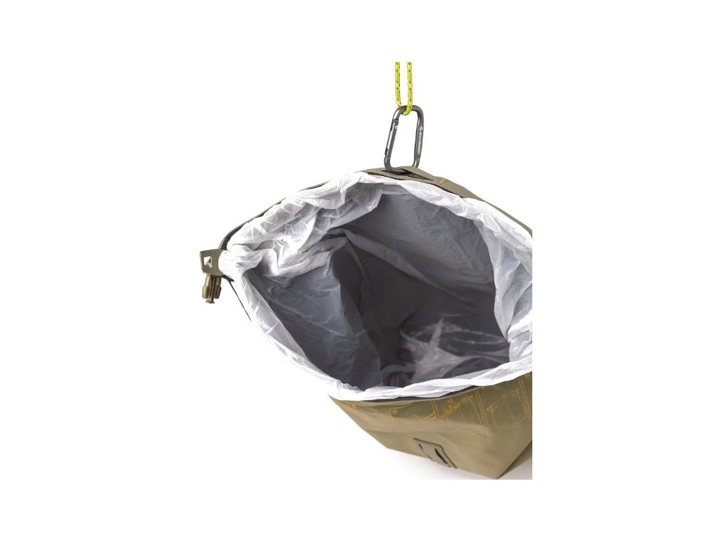 Sea to Summit Trash Dry Bag 10l - burnt olive je vybaven jedinečným rolovacím uzávěrem, který jednorázovou vložku v horní části zároveň stlačuje a fixuje, čímž ji stabilizuje během přepravy. Dvojitá horní ucha umožňují pytel pohodlně zavěsit a udržet vstupní otvor otevřený při vhazování odpadu při kempování nebo jízdě na kajaku. Na bocích jsou umístěny řetízkové popruhy, které umožňují bezpečně připevnit tašku k batohu, kajaku nebo nosiči zavazadel, čímž se snižuje riziko přemístění nákladu. Tento typ konstrukce usnadňuje systematické shromažďování odpadu a jeho přepravu na místa likvidace.