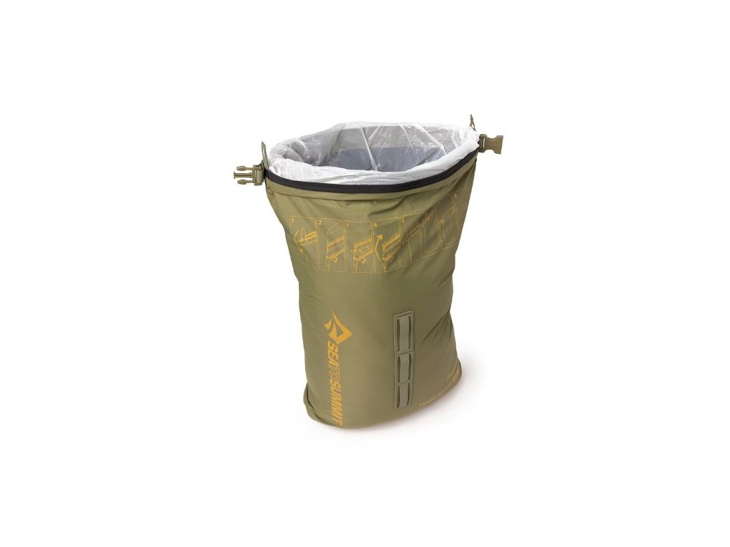 Sea to Summit Trash Dry Bag 10l - burnt olive je specializovaný nepropustný přepravní model pro ukládání odpadu během outdoorových aktivit. Vnější vrstva je vyrobena z nepromokavého nylonu 70D s podlepenými švy, které snižují riziko pronikání vlhkosti a úniku do vnějšího prostředí. Konstrukce je kompatibilní s jednorázovými sáčky na odpadky, které slouží jako vnitřní vložka a usnadňují hygienickou likvidaci obsahu po návratu z kempování. Použití recyklovaného nylonu s certifikací RCS a bluesign® zapadá model do moderních standardů designu turistického vybavení.