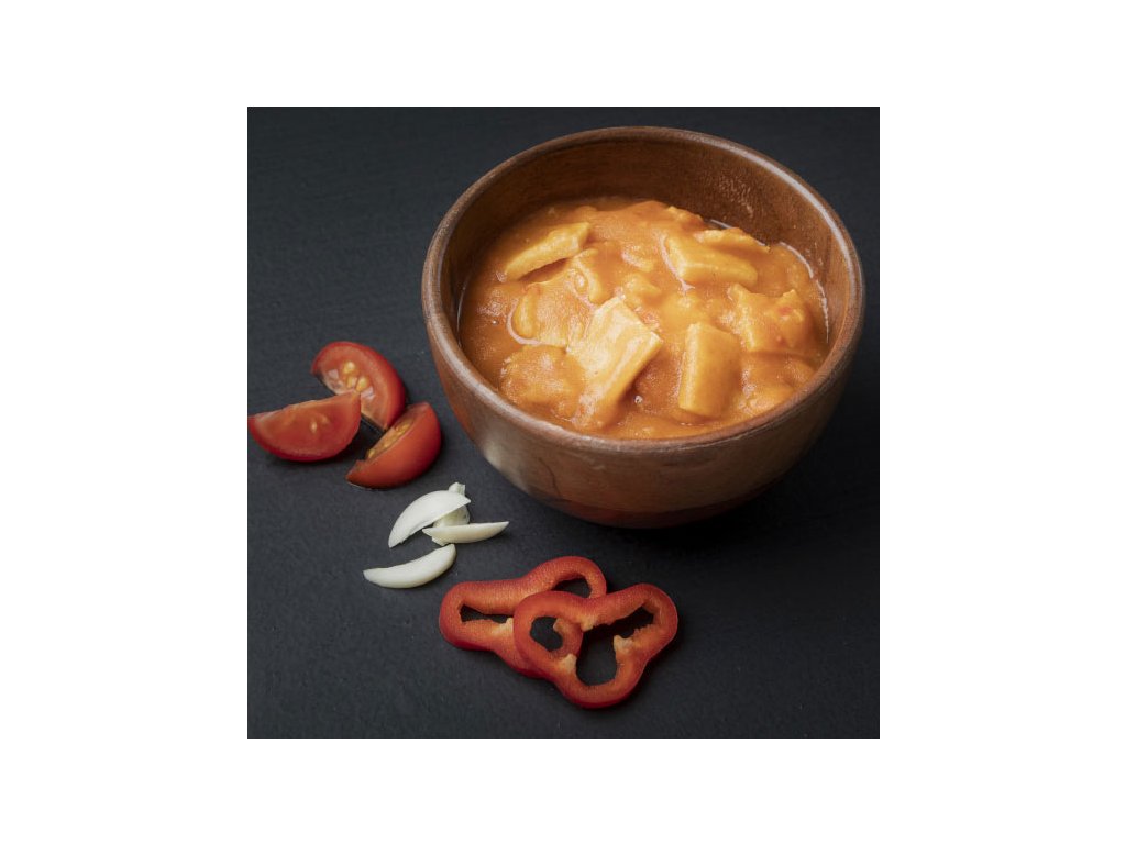 Real Turmat Bacalao z tresky a brambor, inspirované portugalskou kuchyní. Pokrm doplňuje zelenina jako cibule, paprika a rajčata.