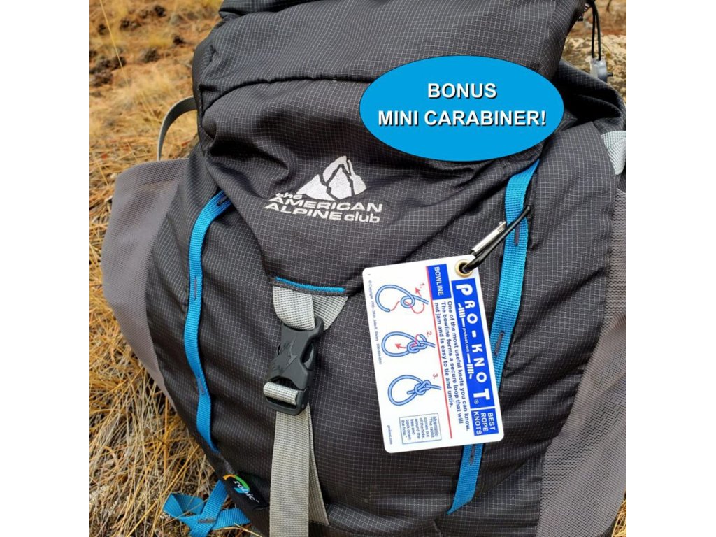 K procvičování vázání uzlů použijte přiloženou šňůru a karabinu. Můžete se naučit svázat dvě lana dohromady dvěma šňůrami (každá 71cm z vysoce kvalitního 3 milimetrové statické šňůry, která je kvalitnější než paracord a snáze se váže a rozvazuje), naučit se vázat lano k předmět (stahovací uzel) s přiloženou karabinou a samozřejmě použijte jednu šňůru k procvičování smyčkových uzlů jako je Bowline.Součástí je také mini karabina pro připevnění karet k batohu.