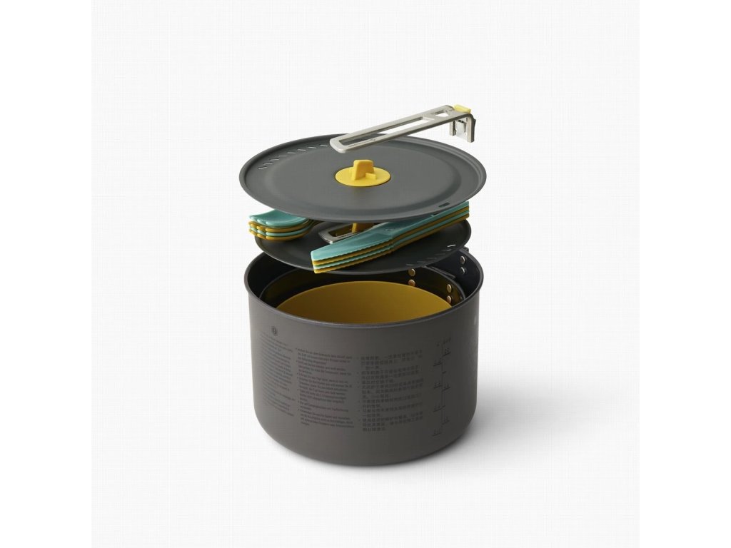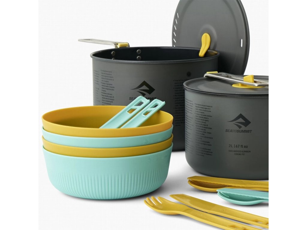 Sada nádobí Frontier UL Two Pot Cook Set 4P 14 Piece od značky Sea to Summit obsahuje 2 hrnce o objemu 2l a 3l, 4x misku o objemu 720 ml a 8 ks příborů (4 vidličky, 4 nože). Vše pohodlně schováte do vnitřku hrnce a zajistíte unikátní odnímatelnou rukojetí.