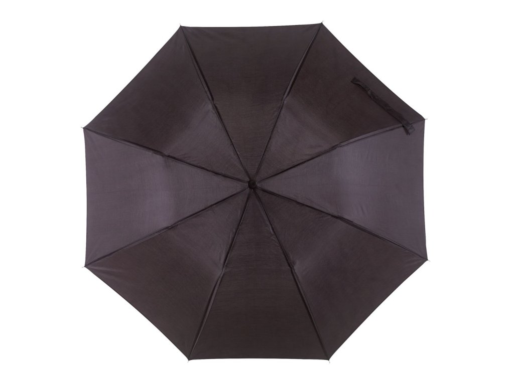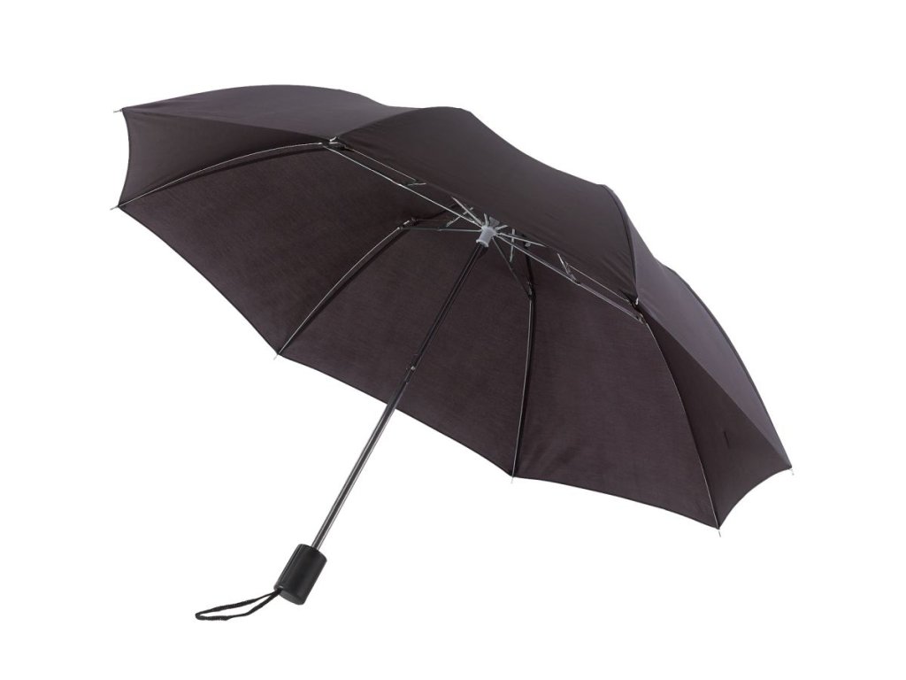 Skladaací deštník s manuálním otvíráním, černou plastovou rukojetí s polyesterovou stříškou. 2dílným kovový rám s kovovými žebry. Zapínání na suchý zip. Obal