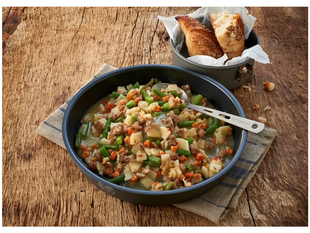 Vyznavače masových pokrmů potěší vydatná hovězí pochoutka s bramborem a fazolemi, která chutná jako "od babičky". K přípravě je potřeba pouze 550 ml horké vody. Pokrm lze pak konzumovat přímo z originálního sáčku s pomocí dlouhé lžíce. Mimochodem, necháte-li pokrm macerovat o 3 min déle, než je doporučeno na sáčku, budou jednotlivé kousky vláčnější a jemnější.