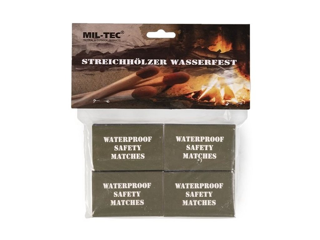 Speciální voděodolné zápalky, čtyři krabičky sirek v balení.